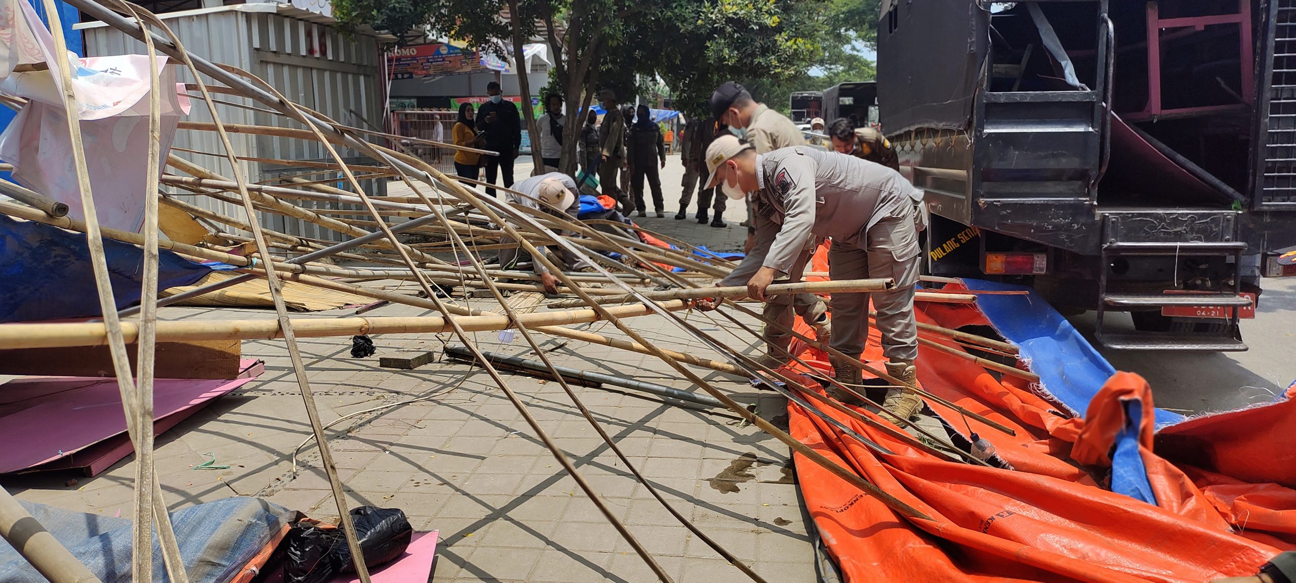 Pemilik warung hanya terlihat berdiri dan pasrah melihat puluhan personel Satpol PP menarik bangunan yang semi permanen sampe roboh, dan memukul bambu-bambu yang di tempelkan dengan paku.