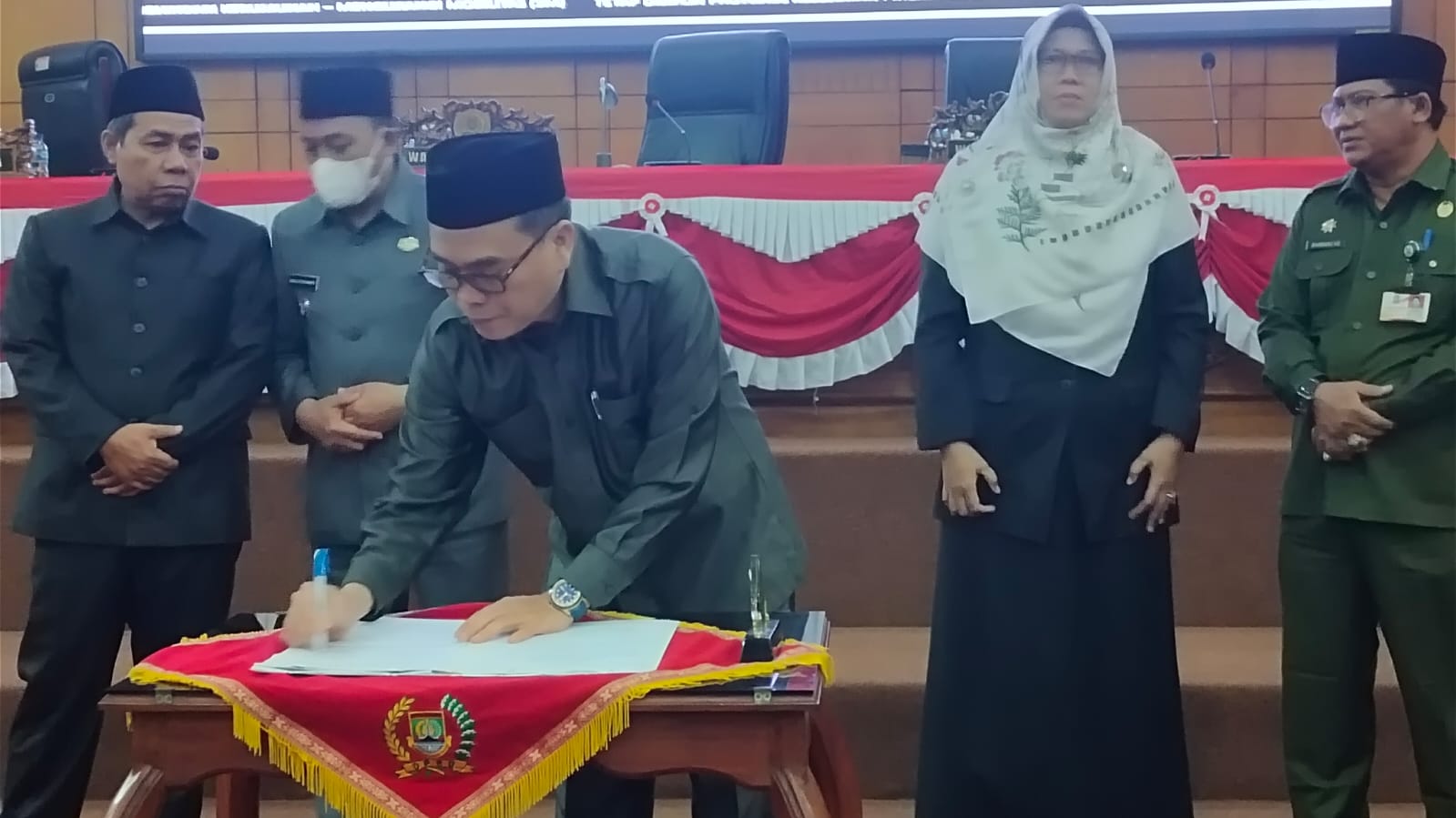 Wakil Ketua DPRD Kota Cilegon Hasbi Sidik, tengah menandatangani perumusan Raperda mejadi Perda, didampingi Wakil Ketua DPRD Cilegon Nurrotul Uyun, Wakil Wali Kota Cilegon Sanuji Pentamarta. Amul/Megatrust.co.id