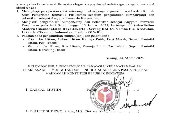 “Mengikuti pengambilan sumpah/janji dan pelantikan anggota Panwaslu Kecamatan pada Sabtu, 15 Maret 2025, yang bertempat di Swiss-Belinn Modern Cikande (Jalan Raya Jakarta-Serang KM 68, Nambo Ilir, Kibin, Cikande, Indonesia) pukul 08.00 WIB,” bunyi tulisan dalam surat.