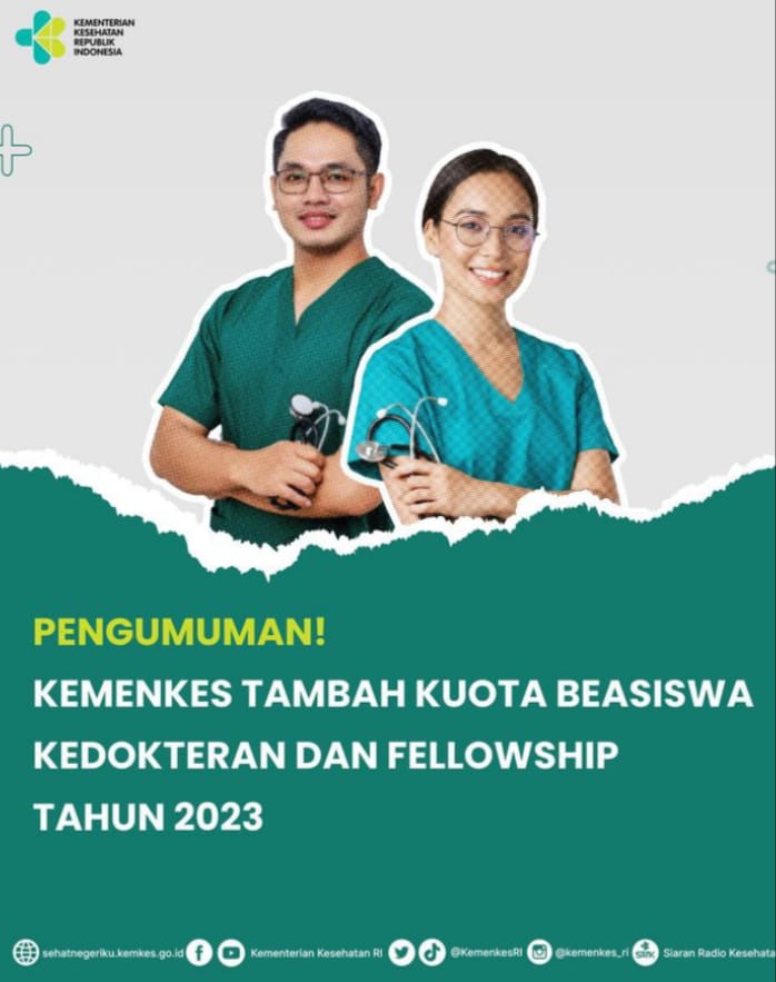 Demikian informasi terkait program bantuan pendidikan atau penambahan kuota beasiswa Kedokteran dan Fellowship pada Kemenkes tahun 2023. Semoga bermanfaat. (Nad/Amul)