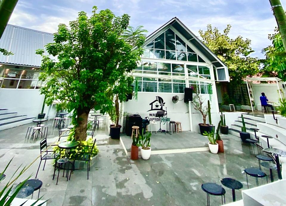 Yaps, tempat nongkrong ini bernama Warung Kopi (Warkop) Rumah Hijau. Seperti namanya, tempat ini dihiasi beragam tanaman hijau nan rindang dan pohon ketapang serta beberapa jenis pohon lainnya termasuk kaktus.