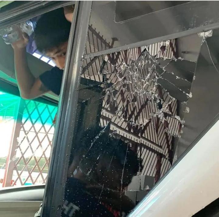 Atas kejadian tersebut, terlihat kerusakan terjadi di beberapa titik bus yang dinaiki oleh pemain dan official Timnas Thailand seperti kaca yang pecah dan retak.