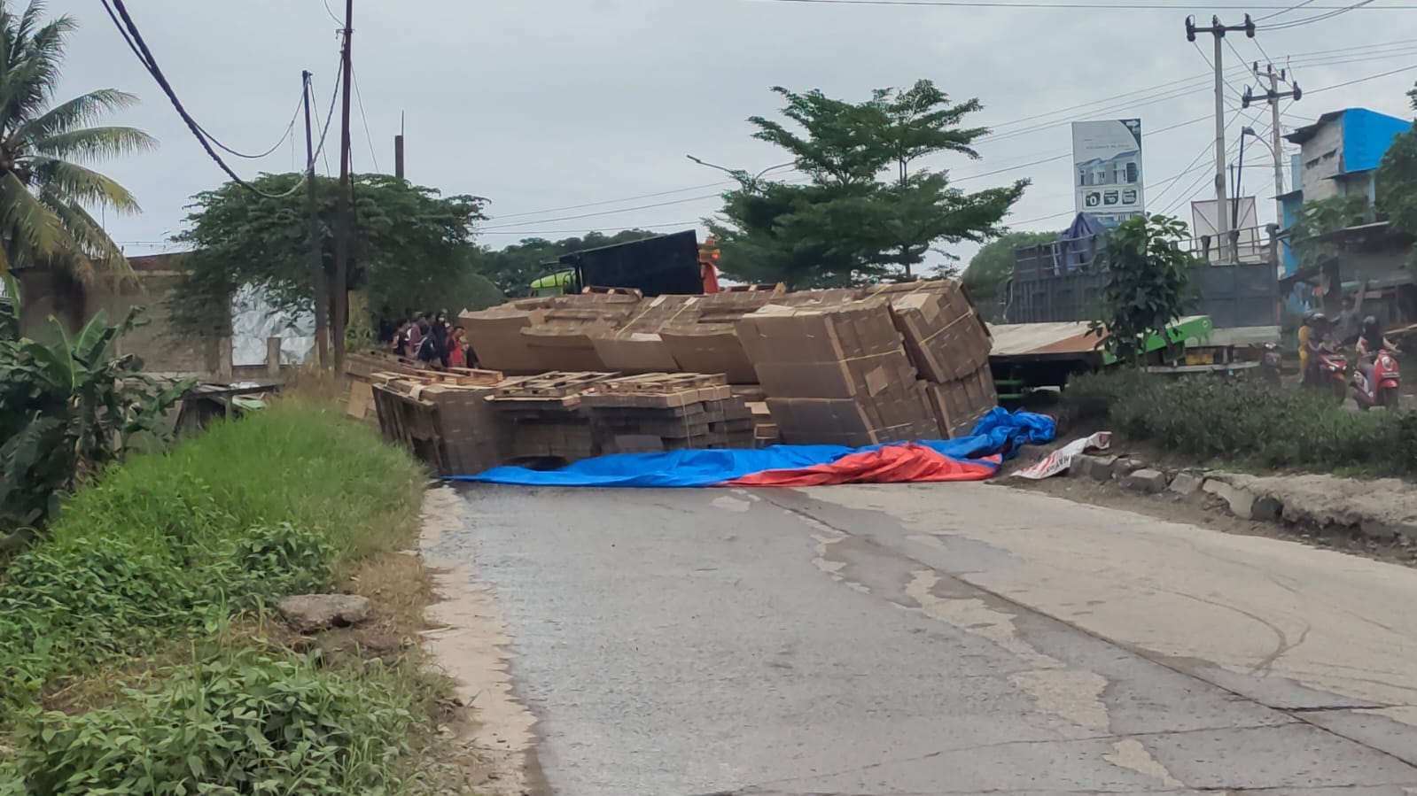 Berselang, kurang lebih 2 jam, atau sekira pukul 12.30 WIB, barang berupa dus yang berada diatas truk tersebut akhirnya jatuh, beruntung truk tidak terlalu jauh tergulingnya, sehingga aparat mudah melakukan evakuasi.