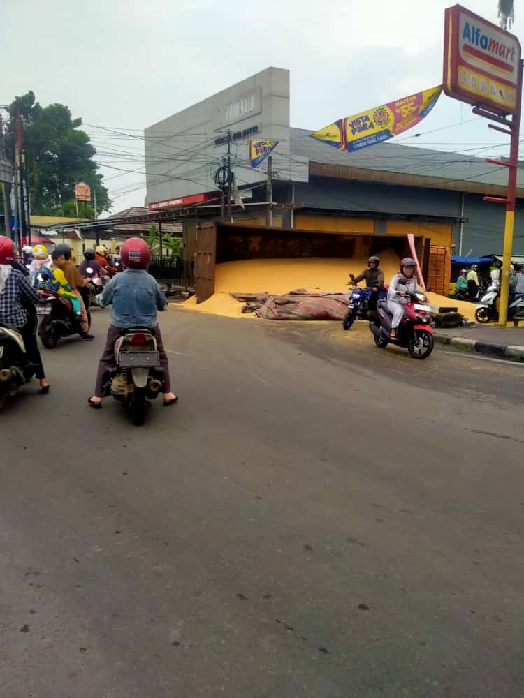Dari pantauan Megatrust.co.id di lokasi, truk yang terguling menumpahkan muatan berupa pakan ternak berwarna kuning.