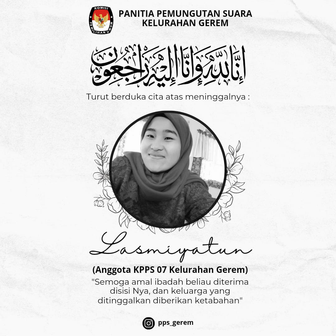 Kordinator Divisi Partisipasi Masyarakat KPU Kota Cilegon Nunung Nurjanah membenarkan kabar tersebut bahwa anggota KPPS yang meninggal dunia, itu bernama Lasmiyatun. Menurut kabar, almarhumah meninggal karena sakit.