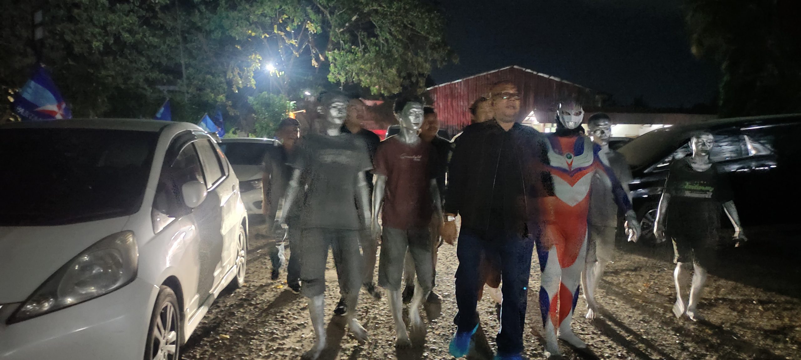 Beda dari yang lain, kedatangan pria yang akrab disapa FK ini didampingi oleh manusia silver dan cosplay ultraman.