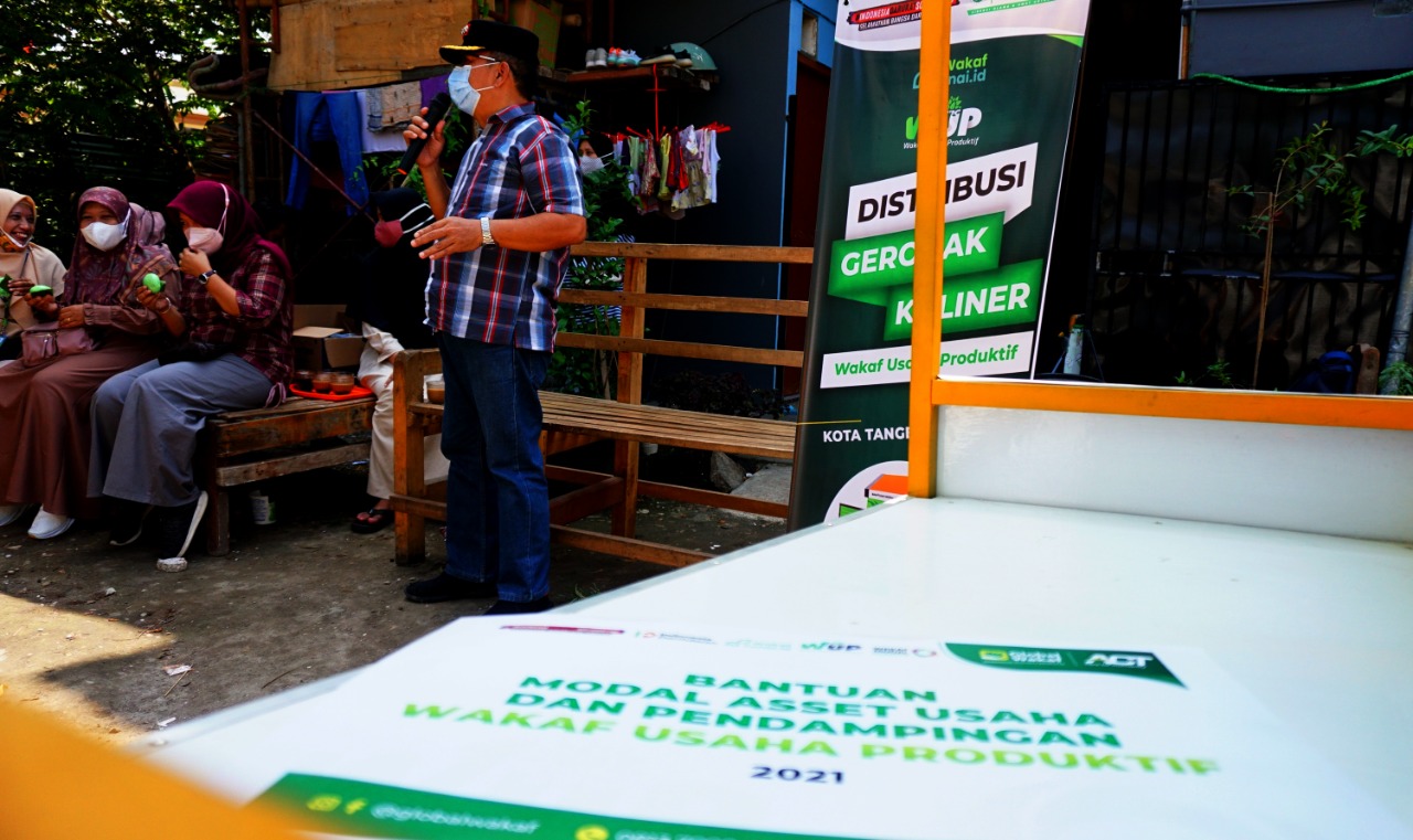Aksi Cepat Tanggap (ACT) Tangerang Kota melalui program Wakaf Usaha Produktif (WUP) berikan gerobak kepada pelaku Usaha Mikro Kecil Menengah (UMKM) Kelurahan Poris Gaga Baru Kecamatan Batuceper Kota Tangerang, dalam acara tersebut Camat Batuceper Rahmat Hendrawijaya menyerahkan gerobak mie ayam kepada Gofar selaku penerima dan penggiat UMKM di wilayah tersebut. Sabtu (18/9/21). Megatrust/Dennys