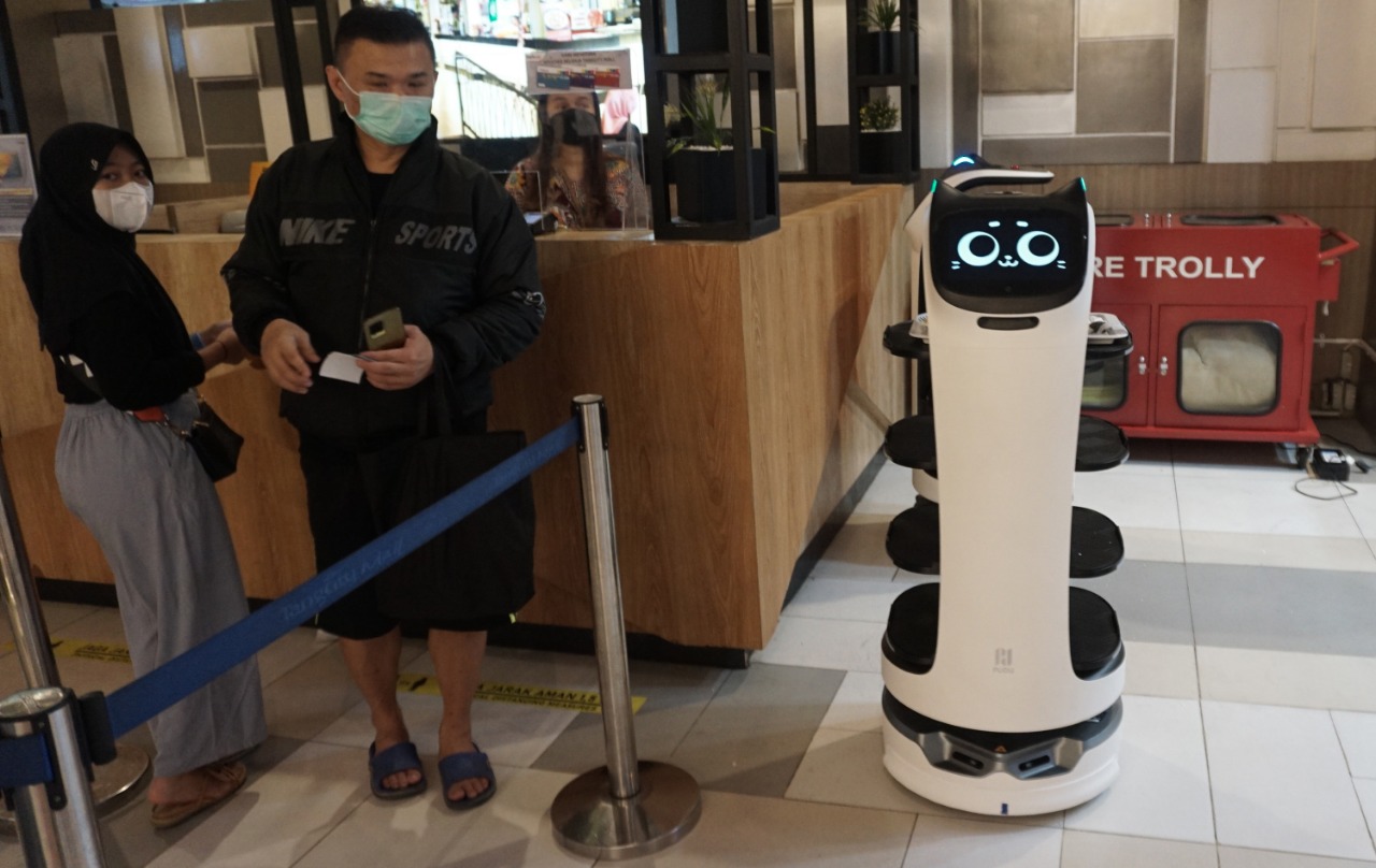 Sejak diperbolehkannya kembali anak-anak masuk Tangerang City Mall pihak manajemen tangcity kembali memanjakan anak-anak dengan memperkenalkan robot yang di berinama Bellabot robot ramah, kehadiran bellabot ini menjadi satu dayatarik bagi pengunjung terutama anak-anak, tugas dari bellabot sendiri selain melayani para pembeli (mengantarkan makanan) robot ramah tersebut juga membagikan makanan ringan dan balon bagi anak-anak di area Food Court Rame-Rame Festival Lt. 2 Tangcity Mall. Jumat (15/10/21). Megatrust/Dennys