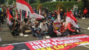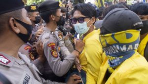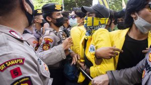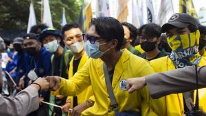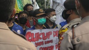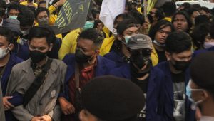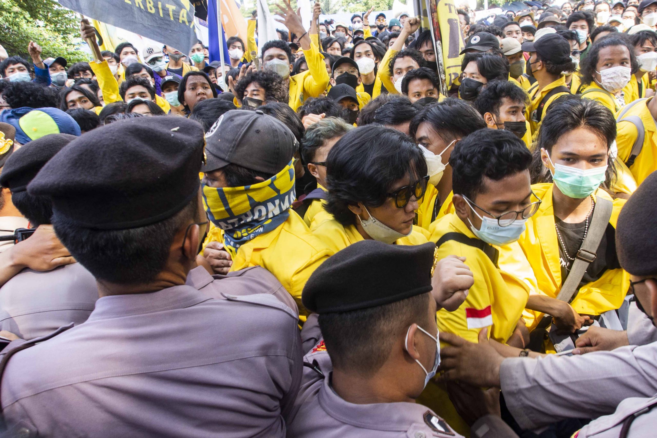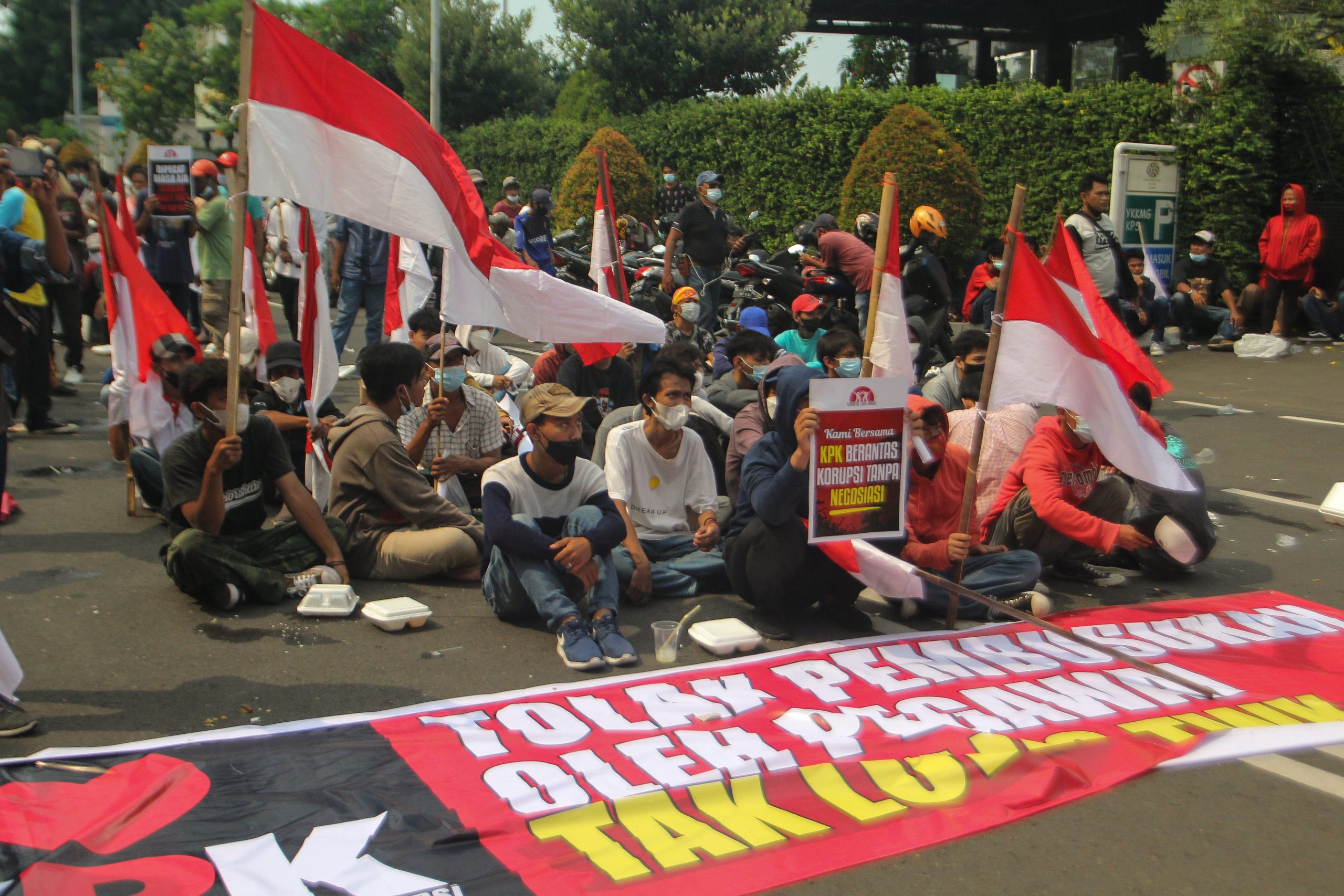 Ratusan mahasiswa yang tergabung dalam Badan Eksskutif Mahasiswa Seluruh Indonesia (BEM SI) dan Gerakan Selamatkan KPK (GASAK) menyambangi gedung Merah Putih di kawasan Kuningan, Jakarta Selatan, Senin (27/09/2021). Dalam aksi tersebut mahasiswa menuntut Presiden Joko Widodo untuk membatalkan pemecatan terhadap 57 pegawai Komisi Pemberantasan Korupsi (KPK) yang tidak lulus dalam Tes Wawasan Kebangsaan (TWK) serta memecat Ketua KPK Firli Bahuri. Dalam aksinya tersebut mahasiwa yang datang dari berbagai kampus dihadang oleh aparat kepolisian agar tidak maju ke depan halaman gedung anti rasuah tersebut, akibatnya sempat ada saling dorong antara mahasiswa dan petugas. Megatrust/Cecep