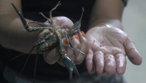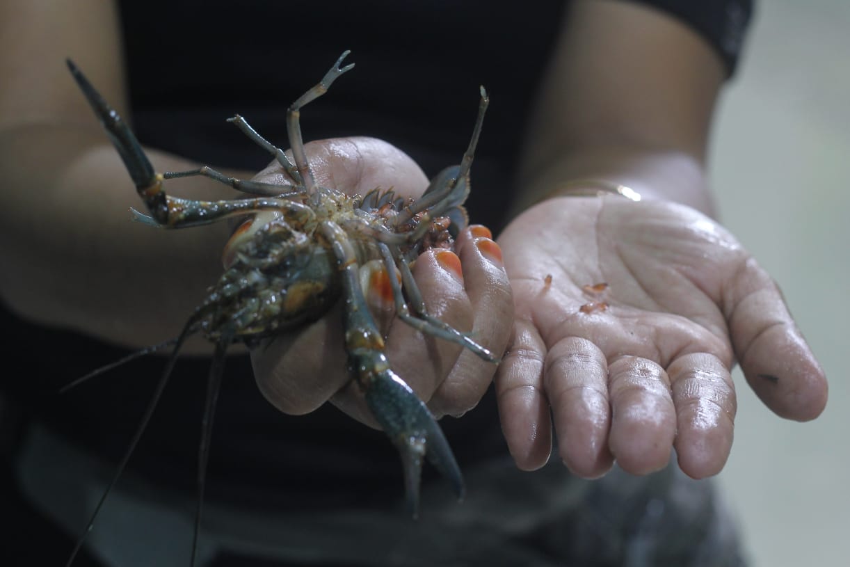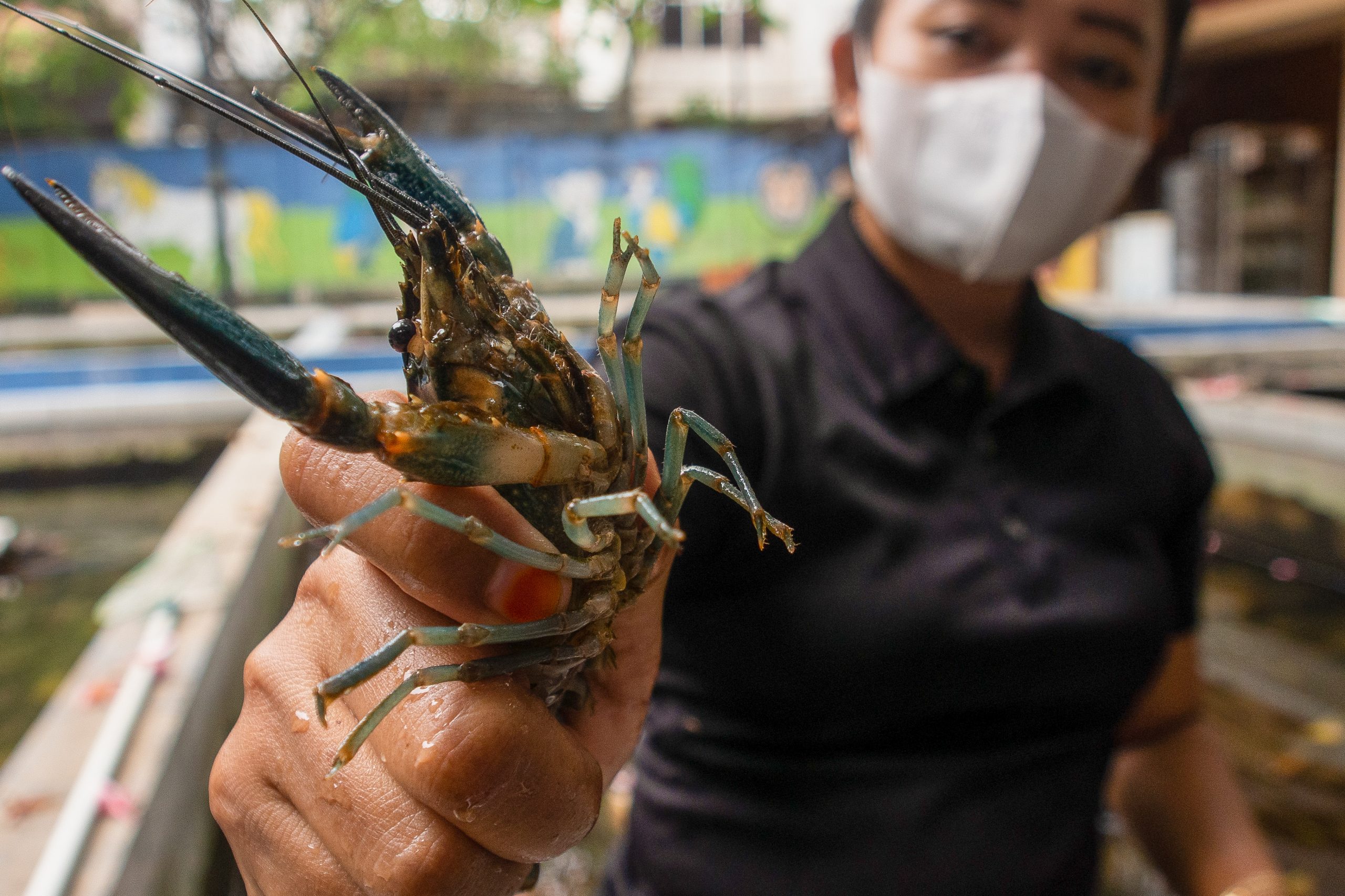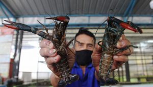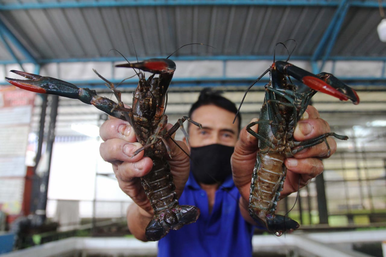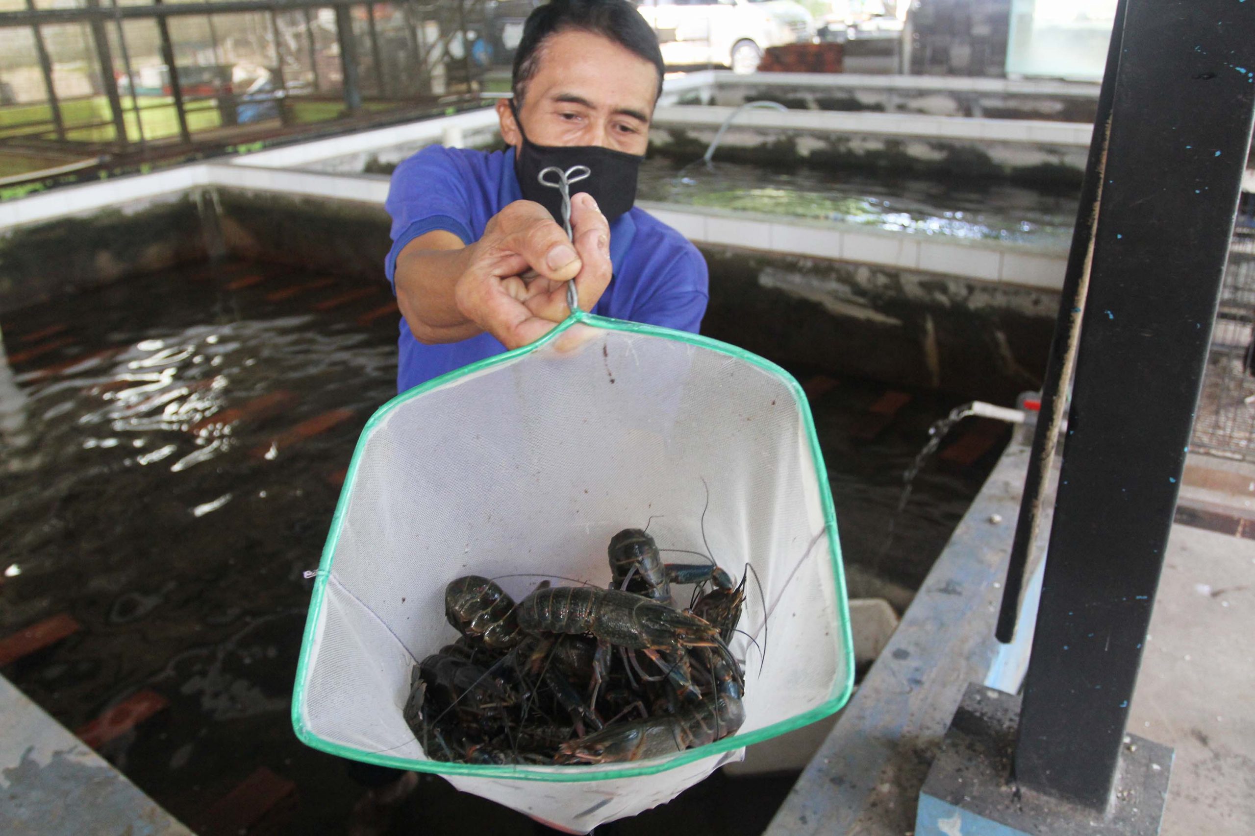 Petani lobster air tawar menunjukkan lobster siap di jual ditempat budidaya lobster air tawar BFC Mini Farm dikawasan Ciputat, Tangerang Selatan, Minggu (10/10/21). Lobster air tawar yang didatangkan dari Australia ini dibudidayakan di Indonesia dan dijual dengan harga Rp 60 ribu hingga Rp 500 ribu per ekor indukan, serta menyediakan lobster Frozen Rp 150 sampai Rp 300 ribu per kilogram untuk lobster konsumsi, yang sebagian besar untuk memenuhi kebutuhan rumah makan seafood di dalam negeri. Megatrust/Cecep
