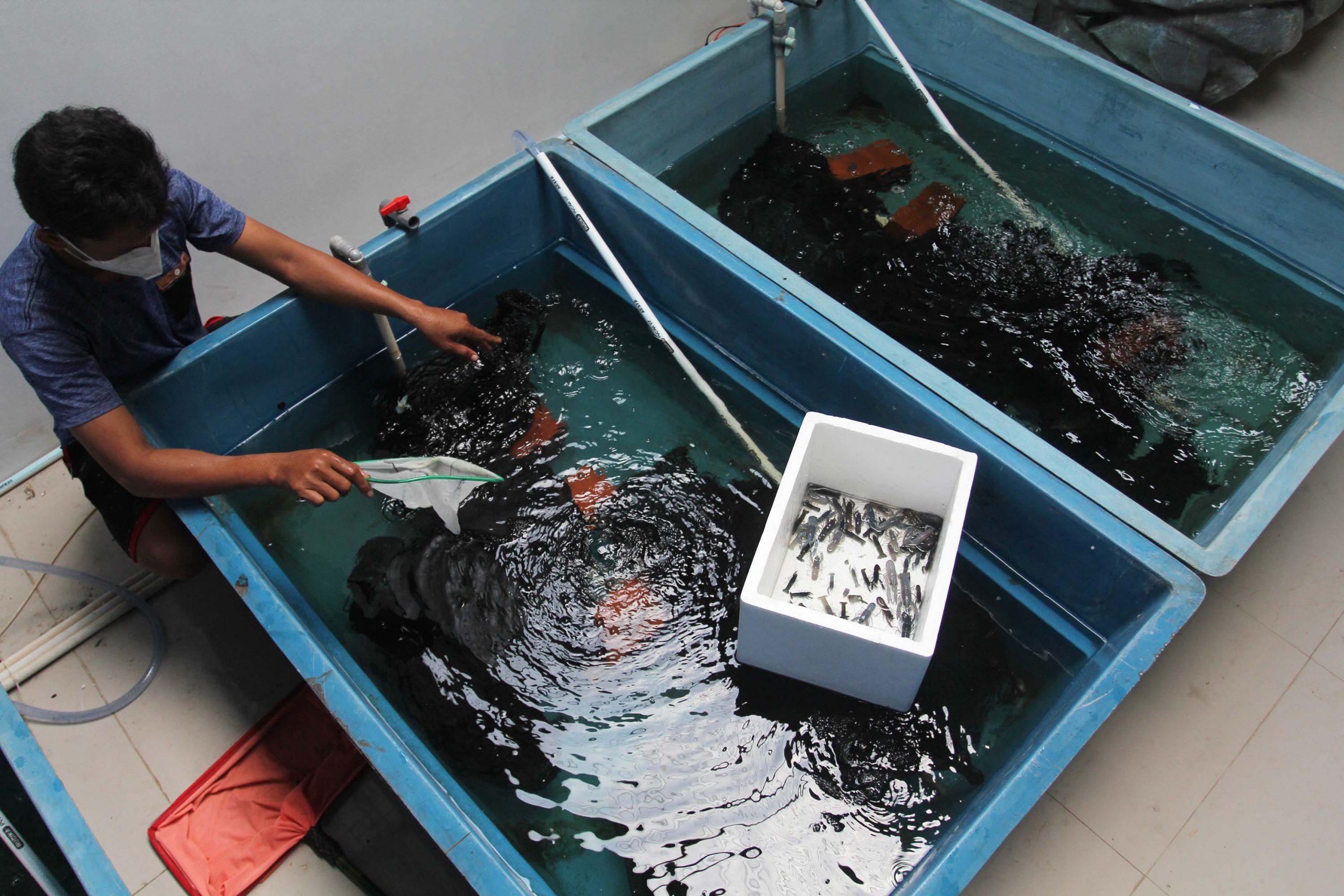 Petani lobster air tawar menunjukkan lobster siap di jual ditempat budidaya lobster air tawar BFC Mini Farm dikawasan Ciputat, Tangerang Selatan, Minggu (10/10/21). Lobster air tawar yang didatangkan dari Australia ini dibudidayakan di Indonesia dan dijual dengan harga Rp 60 ribu hingga Rp 500 ribu per ekor indukan, serta menyediakan lobster Frozen Rp 150 sampai Rp 300 ribu per kilogram untuk lobster konsumsi, yang sebagian besar untuk memenuhi kebutuhan rumah makan seafood di dalam negeri. Megatrust/Cecep