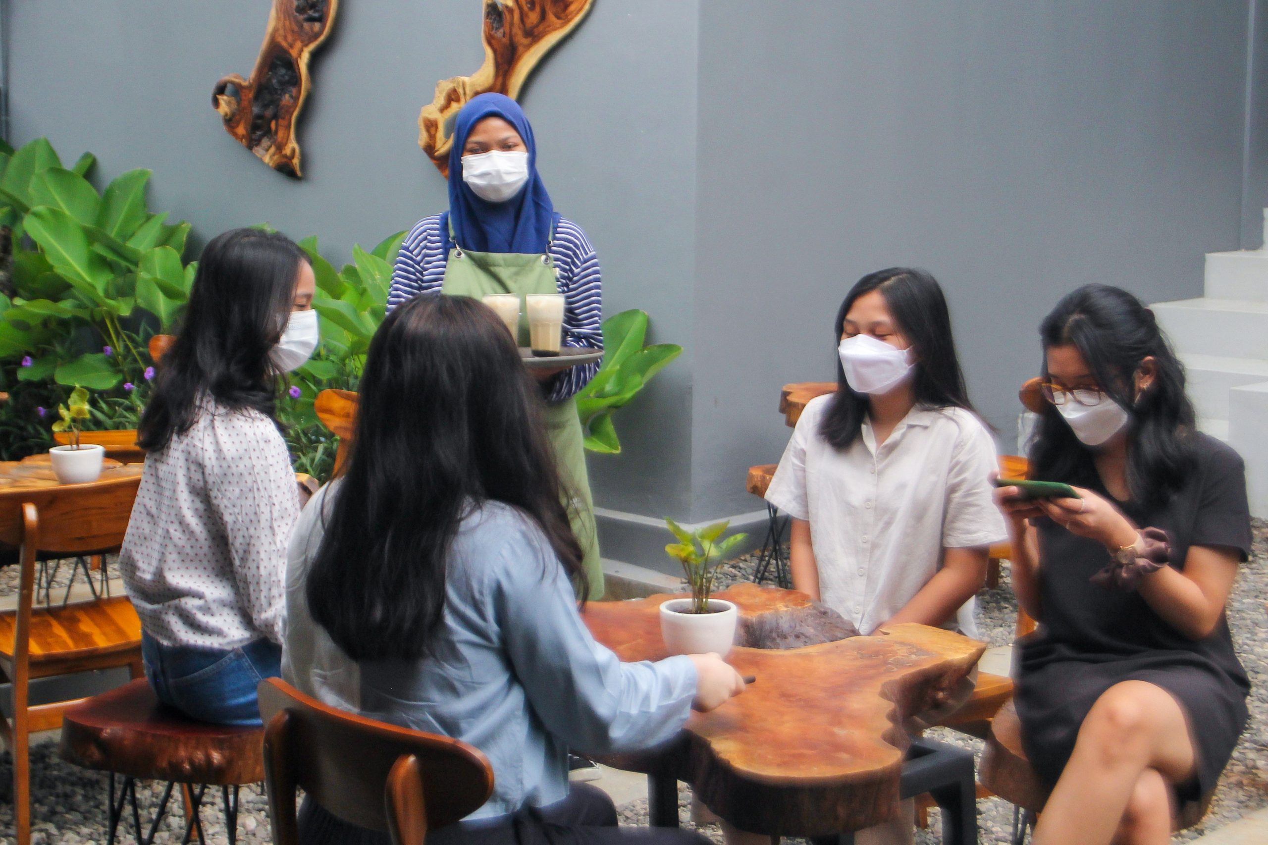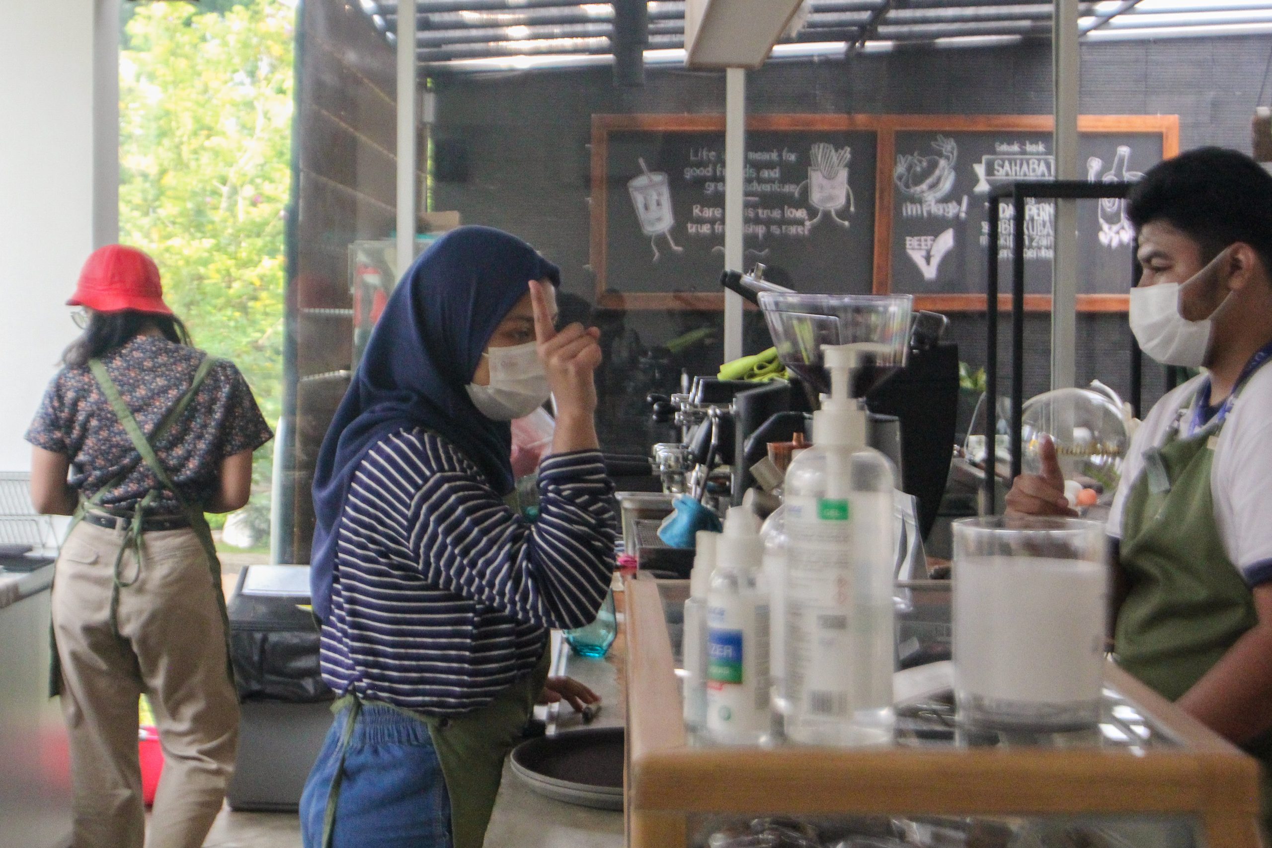 Seorang pelayan kafe penyandang tuna rungu atau tuli melayani pengunjung memesan makanan dan minuman menggunakan bahasa isyarat di Kafe Taman Tuli Serona Bintaro, Tangerang, Selatan, Banten, Selasa (28/9/2021). Kafe Teman Tuli merupakan tempat makan yang mempekerjakan para penyandang tuna rungu atau tuli sebagai tempat berintraksi para penyandang tuna runga dan juga masyarakat umum. Megatrust/Cecep