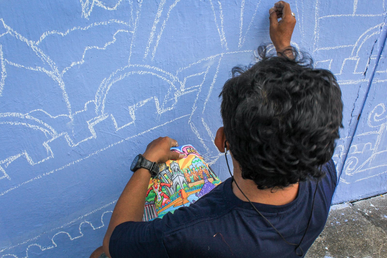 Seniman mural sedang membuat pola mural bertema kebudayaan saat kompetisi mural di Cikokol, Kota Tangerang, Banten, Sabtu (18/12/2021). Kompetisi mural bertema wisata dan kebudayaan yang diikuti sebanyak 163 peserta se-Indonesia yang tergabung dalam 24 tim tersebut bertujuan untuk menyalurkan bakat seni sekaligus mengenalkan unsur-unsur budaya, wisata dan kearifan lokal kepada masyarakat khususnya anak-anak dan generasi muda. Megatrust/Cecep