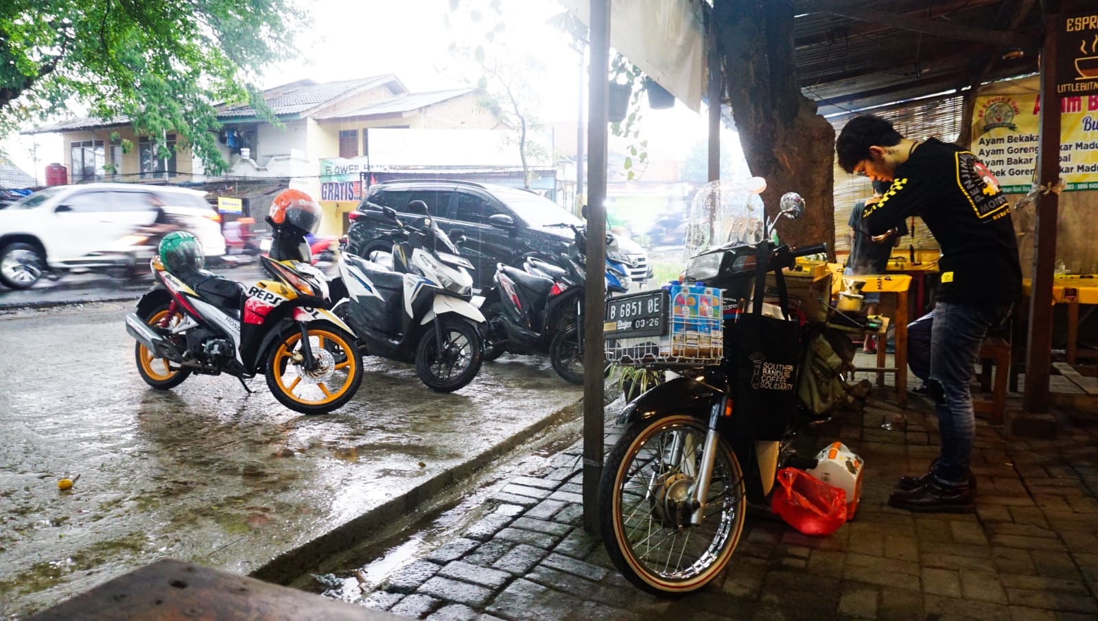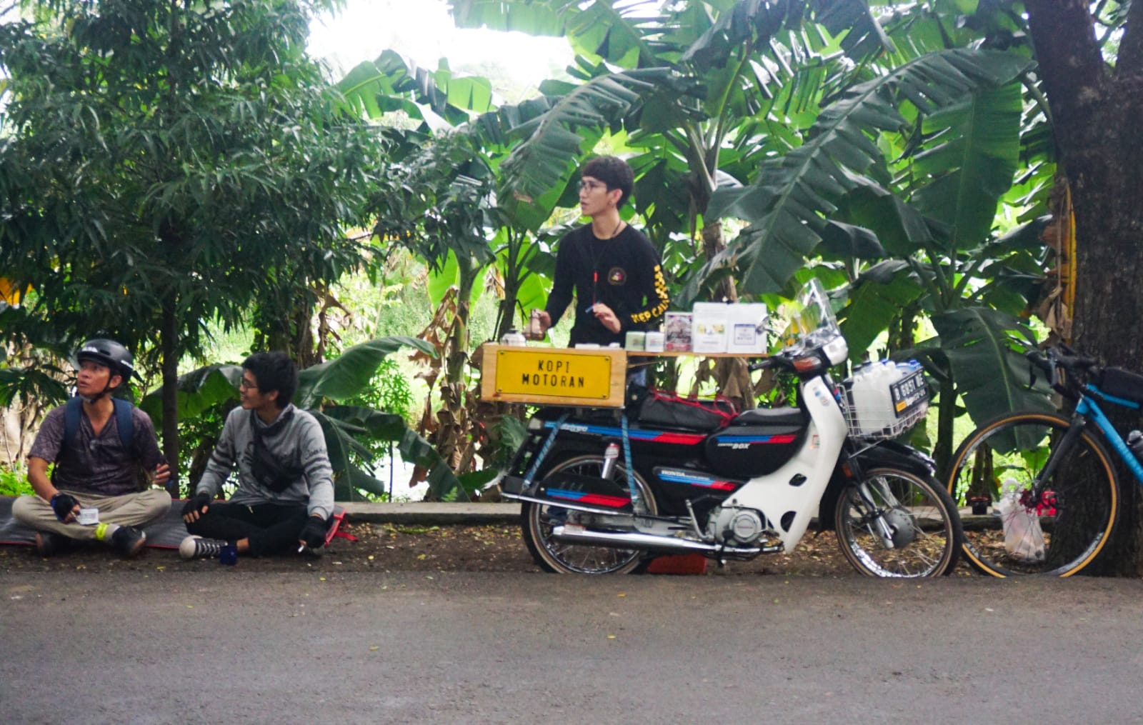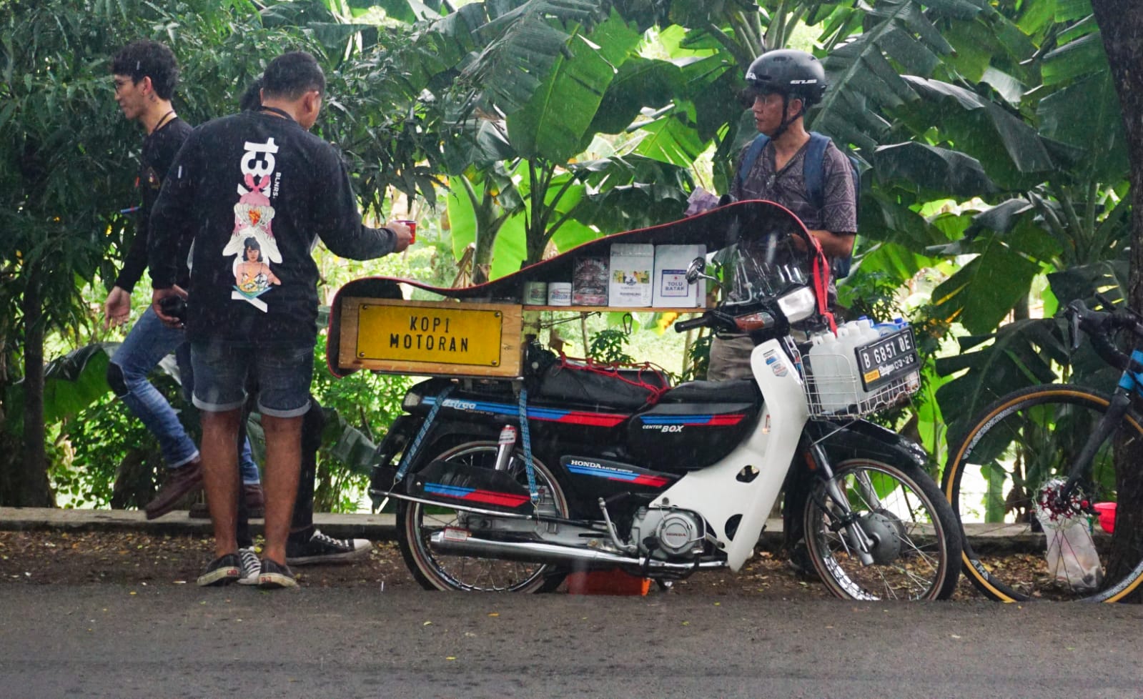 Kopi Motoran merupakan konsep kedai kopi yang hanya bermodalkan motor jadul, beratapkan langit dengan pemandangan jalan Tol. Namun, disitulah nilai daya tarik yang diberikan si pemilik Kopi Motoran, Aliang Lim (28), kepada para pelanggan untuk menikmati secangkir kopi. Menu yang disajikan di Kopi Motoran yaitu Kopi Tubruk, V60, Japanese, Vietnam Drip, Tea, Milk Tea, Fresh Milk, Taro, Chocolate dan Red Velvet. Harganya pun cukup terjangkau, mulai dari Rp8 ribu hingga Rp15 ribu. Rabu (19/10/22). Megatrust/Dennys