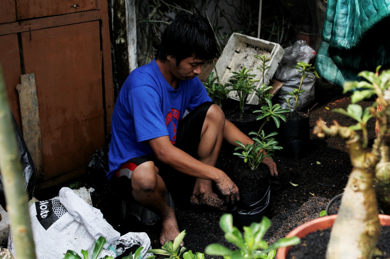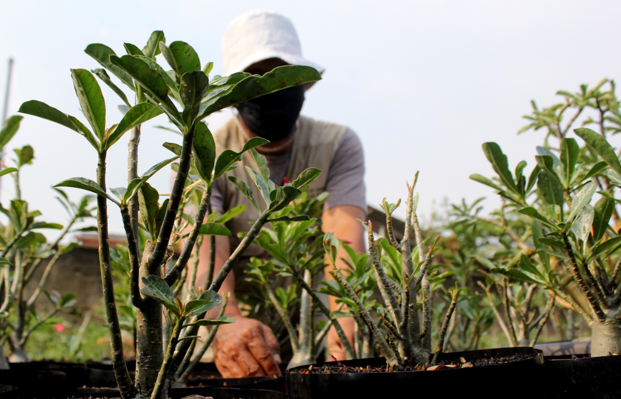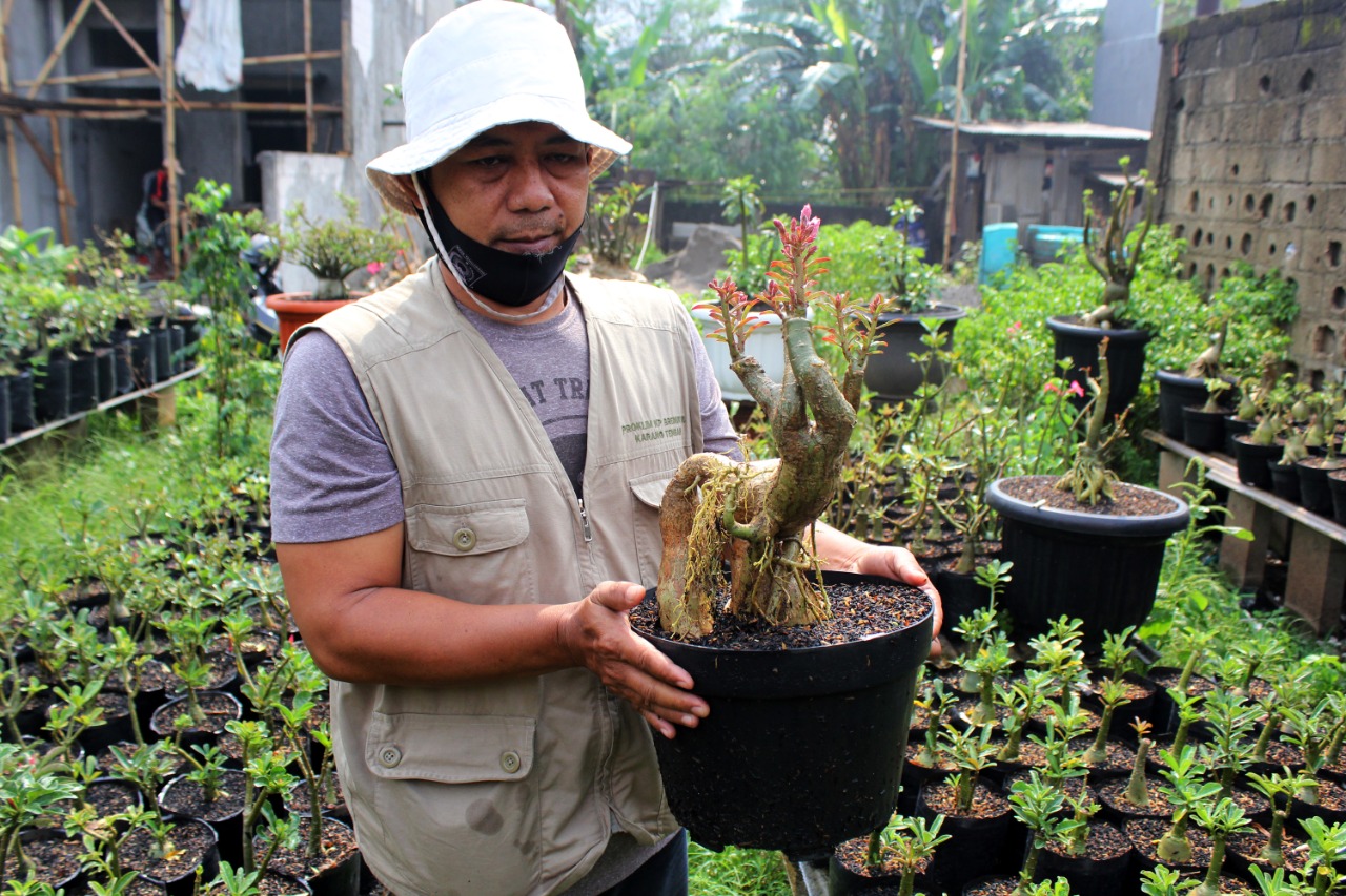 Petani Adenium (Kamboja) ingin mensejahterakan para petani tanaman hias. Ahmad Nurullah (46) petani tanaman hias bonsai Jepang yang berada di Jalan Gang Pahala 1 Rt.001 Rw.008 Kelurahan Karang Tengah, Kecamatan Karang Tengah Kota Tangerang ingin membuat koprasi untuk para penjual tanaman hias, karena diwilayahnya banyak sekali para petani tanaman hias dari berbagai jenis. Selasa (31/8/21). Megatrust/Cecep