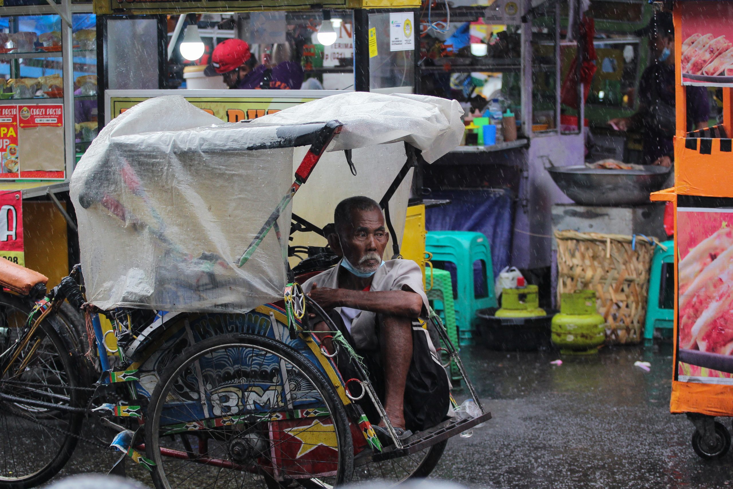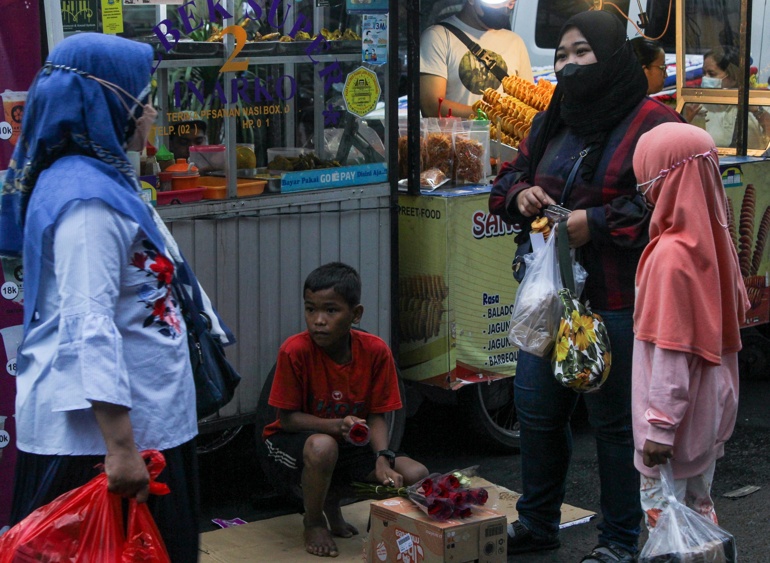 Turunnya PPKM menjadi level 1 kembali meningkatkan kunjungan pengunjung ke kawasan kuliner pasar lama meskipun hujan, mereka yang berusaha mengais rezeki tetap bertahan ditengah hujan meski dipadati pengunjung untuk mencari kuliner khas Kota Tangerang di malam minggu. Sabtu (27/11/2021). Megatrust/Cecep