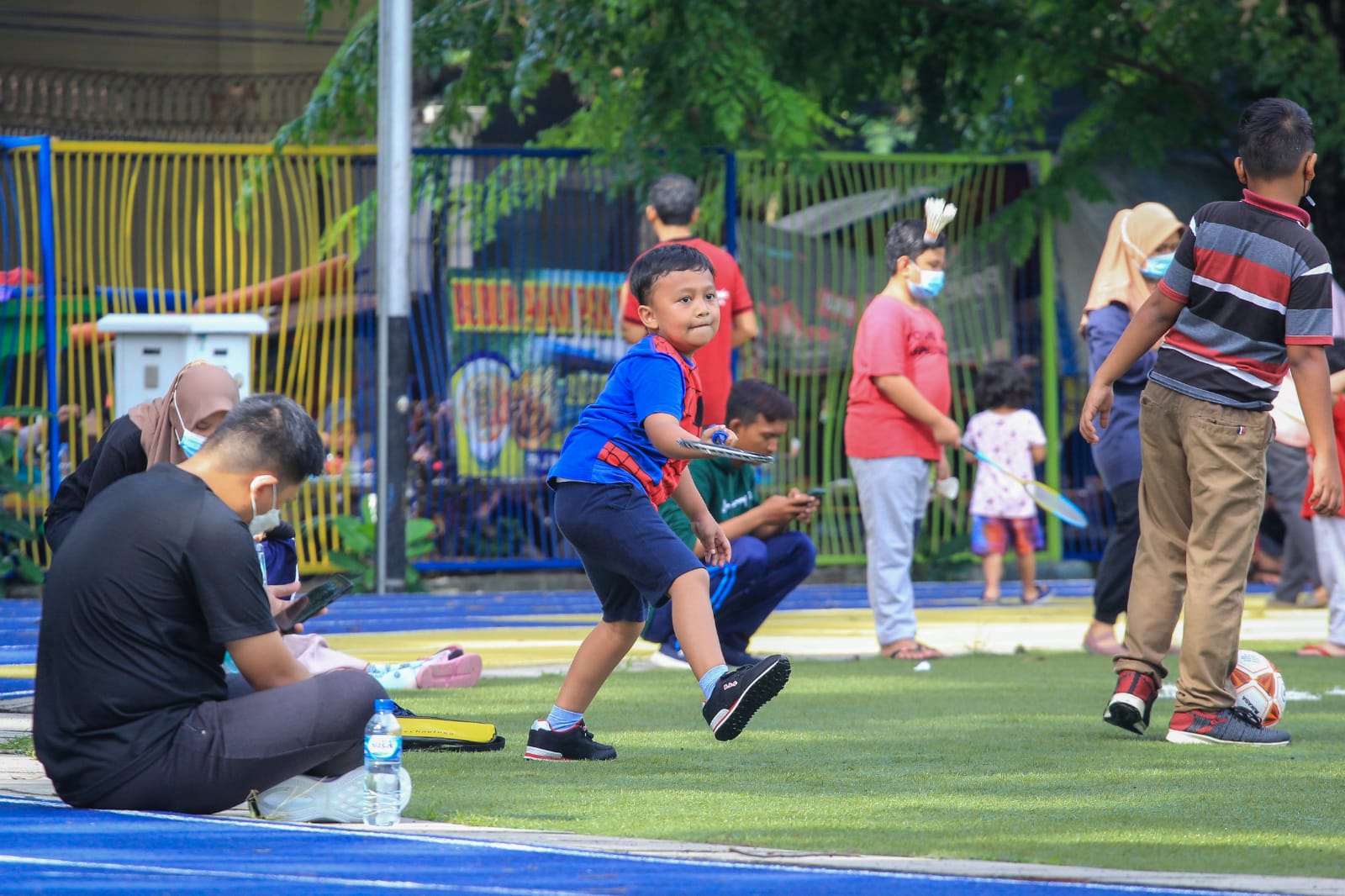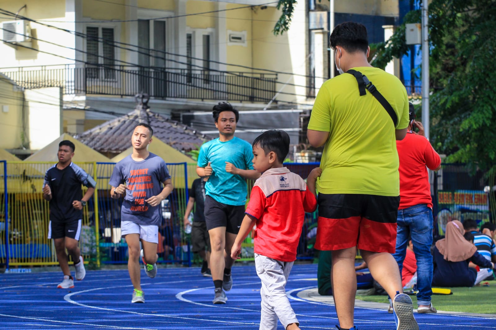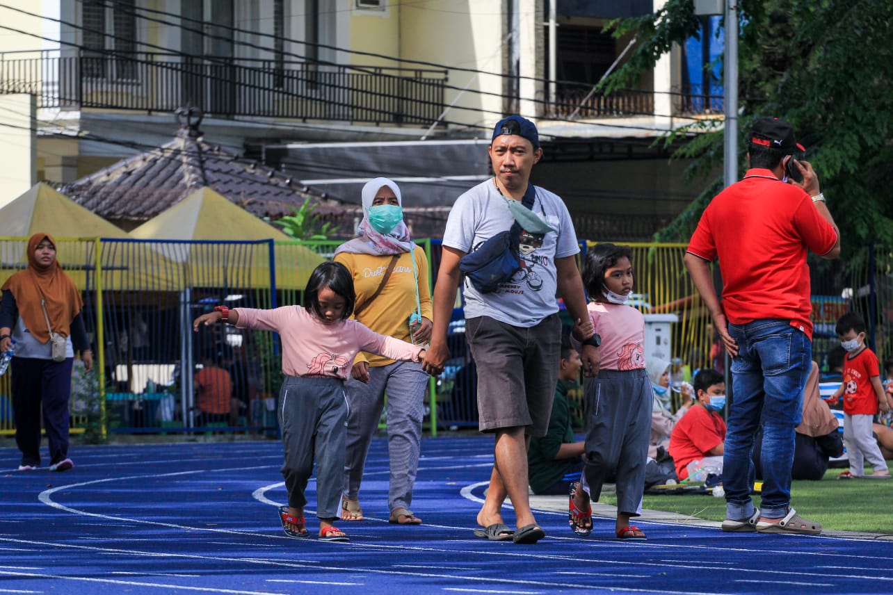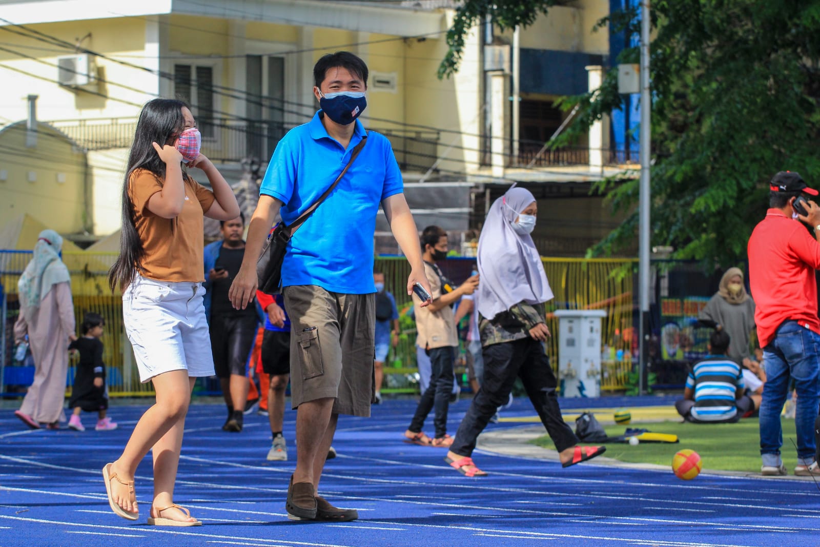 Orang-orang yang memakai masker wajah sebagai tindakan pencegahan terhadap wabah virus corona baru, Aktivitas warga saat berolahraga lari di sepanjang jogging track dan bermain di kawasan Alun-alun Ahmad Yani Kota Tangerang, Banten, Minggu, (26/12/2021). Pemerintah Indonesia pada hari Kamis (16/12) mengumumkan bahwa telah mendeteksi kasus pertamanya varian omicron, pada Kamis (23/12) adanya tambahan kasus positif varian Omicron sebanyak 5 pasien. Total kasus positif varian Omicron di Indonesia bertambah menjadi 8 kasus. (Megatrust/Cecep)