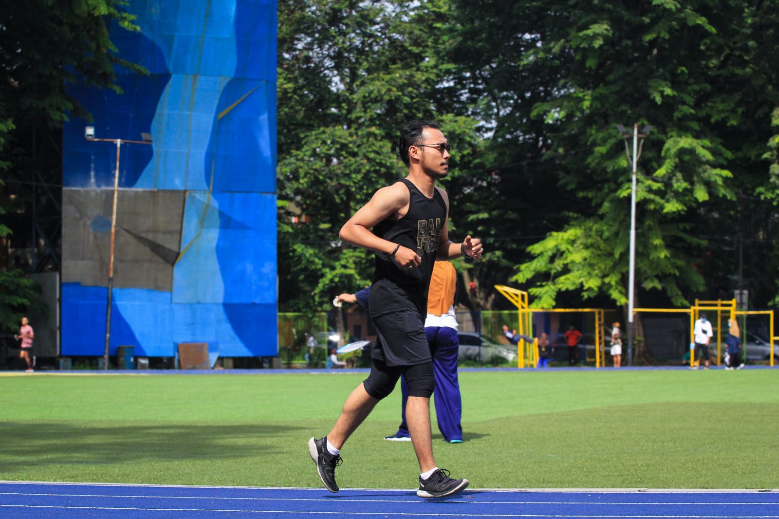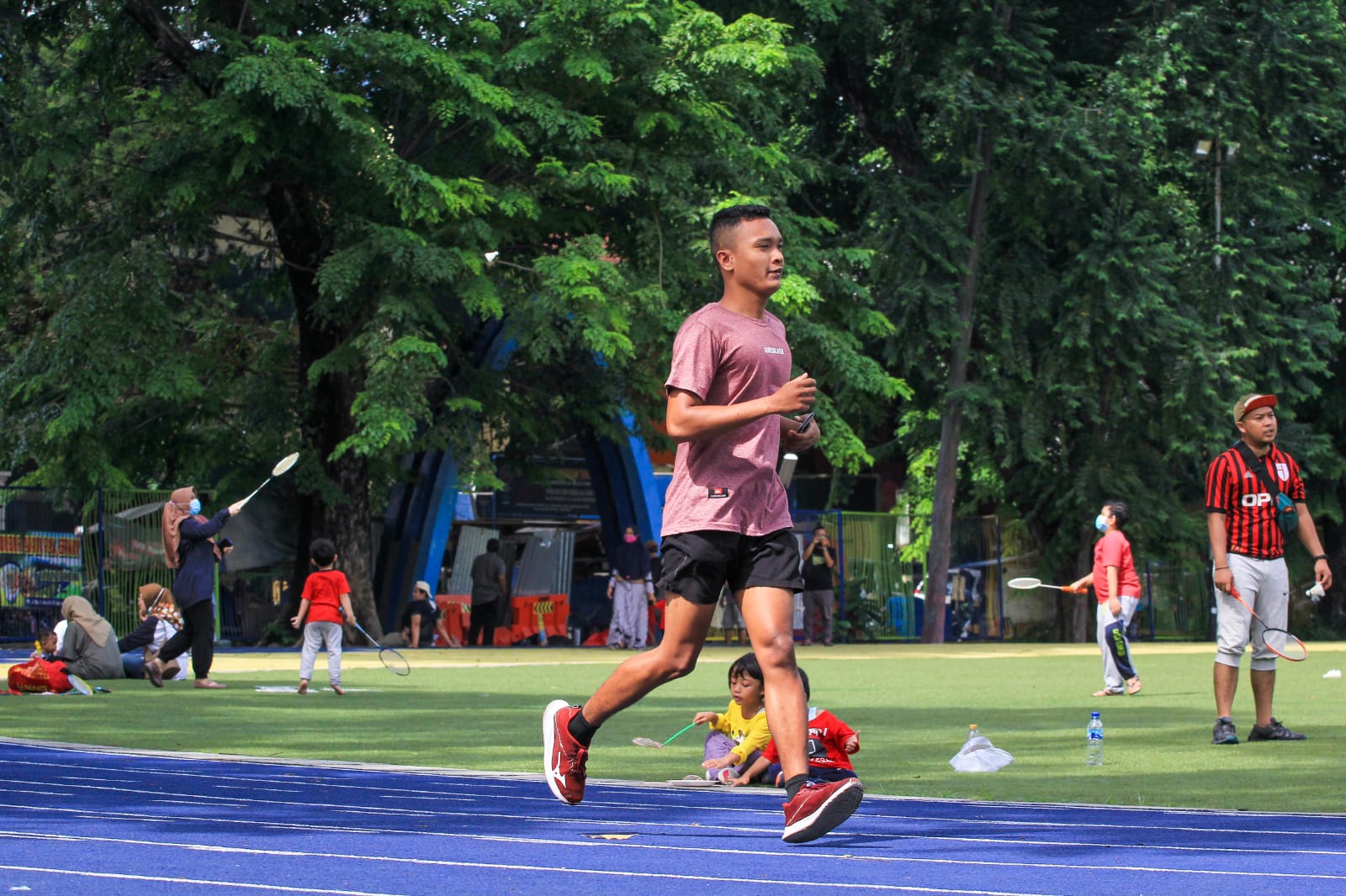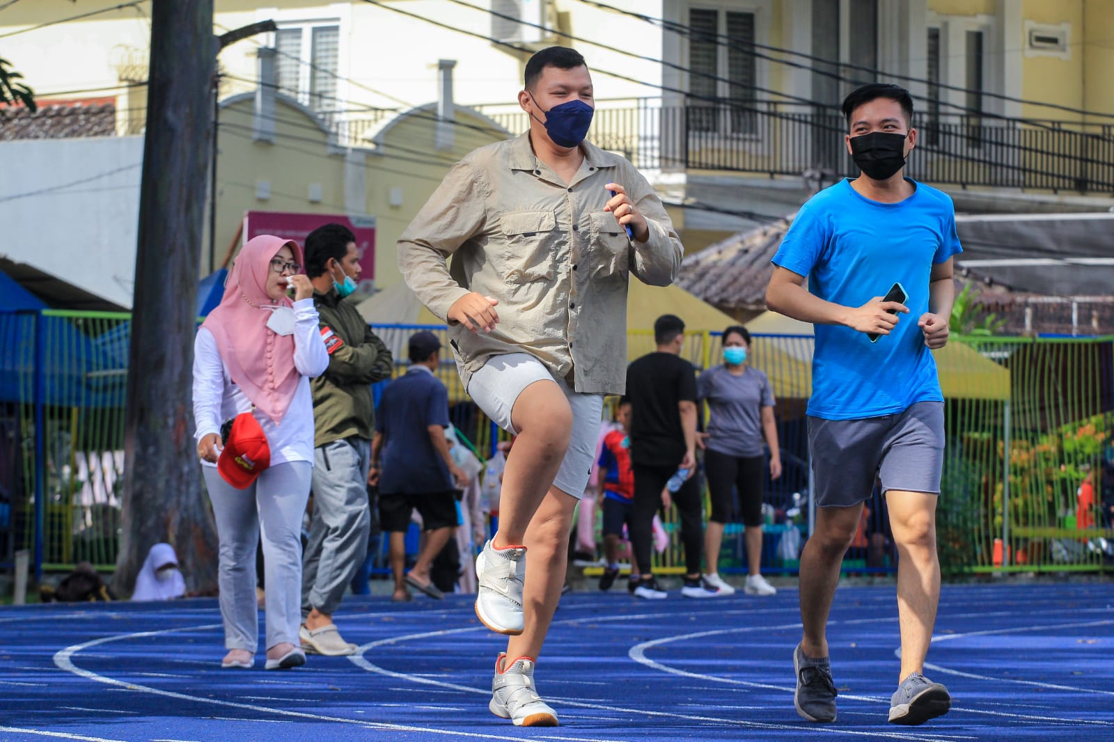 Orang-orang yang memakai masker wajah sebagai tindakan pencegahan terhadap wabah virus corona baru, Aktivitas warga saat berolahraga lari di sepanjang jogging track dan bermain di kawasan Alun-alun Ahmad Yani Kota Tangerang, Banten, Minggu, (26/12/2021). Pemerintah Indonesia pada hari Kamis (16/12) mengumumkan bahwa telah mendeteksi kasus pertamanya varian omicron, pada Kamis (23/12) adanya tambahan kasus positif varian Omicron sebanyak 5 pasien. Total kasus positif varian Omicron di Indonesia bertambah menjadi 8 kasus. (Megatrust/Cecep)