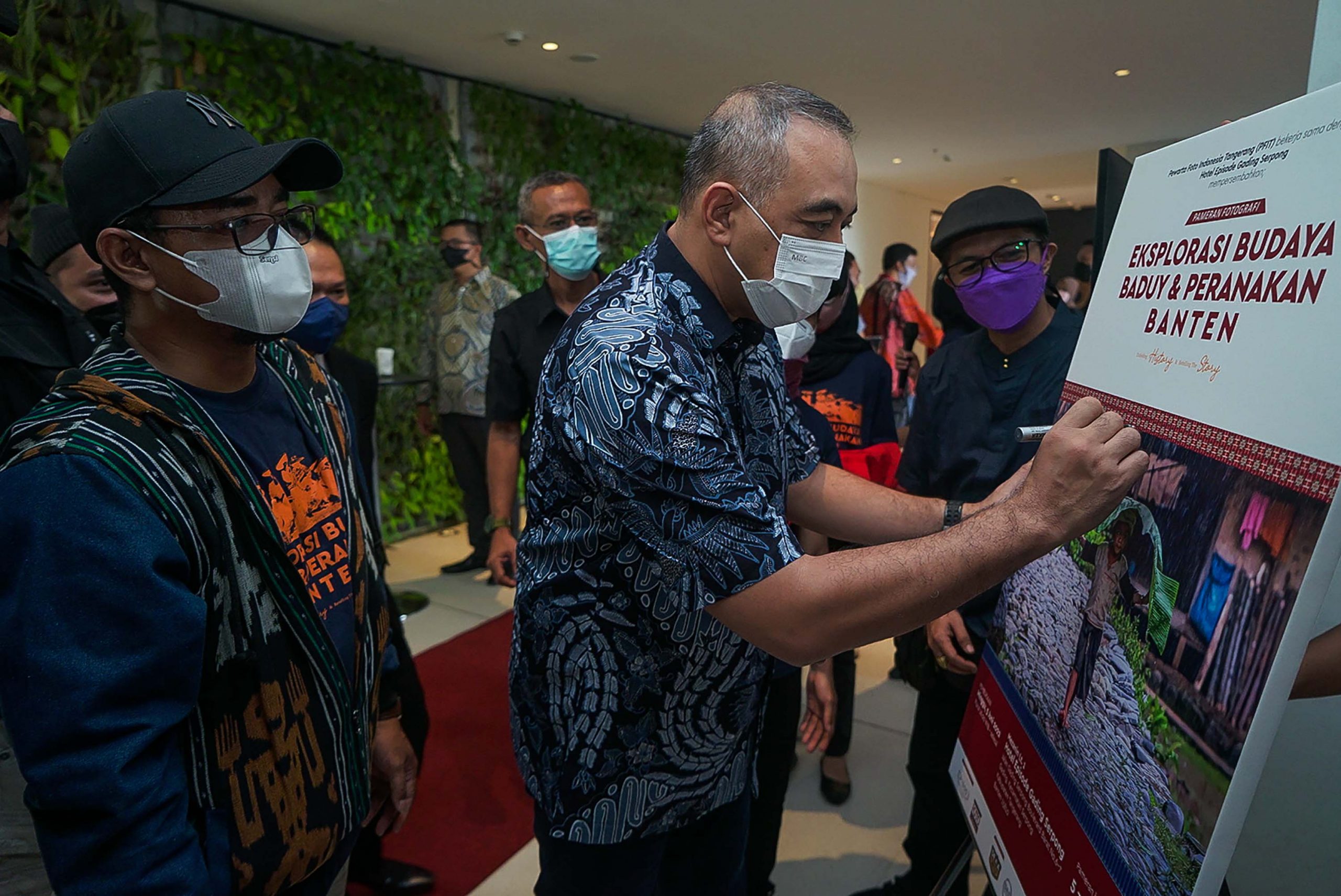 PFI Tangerang pamerkan karya jurnaslistik budaya tertua di Banten, sebanyak 30 foto dipamerkan antara lain budaya baduy dan budaya tionghoa setelah melalui proses seleksi dari 300 foto yang dikumpulkan karya fotografer dari berbagai daerah di Indonesia. Bupati Tangerang Ahmed Zaki Iskandar turut hadir dan membuka pameran “Eksplorasi Budaya Baduy dan Peranakan Banten” bersama Ketua PFI Tangerang Faisal R Syam, di Episode Hotel Gading Serpong, Kabupaten Tangerang. Minggu (5/6/2022). (Foto: PFI Tangerang / Kurniawan Mas'ud)