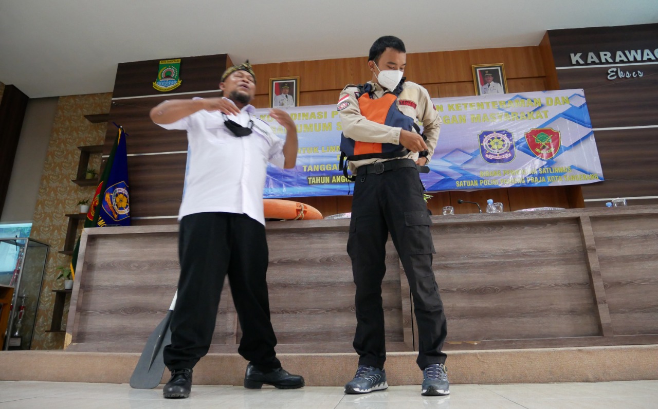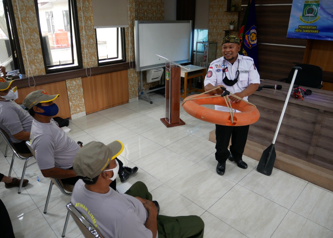 Satuan Tugas Polisi Pamong Praja (Satpol pp) Kota Tangerang adakan pelatihan kebencanaan di 13 Kecamatan yang berada di Kota Tangerang melalui Bidang Perlindungan Masyarakat (LINMAS), dalam pelatihan tersebut bertujuan untuk para anggota linmas yang berada di kelurahan masing-masing mengerti dalam penanggulangan bencana terutama pada masa tanggap darurat dan menjadi ujung tombak saat wilayahnya terkena bencana. Dalam acara tersebut Satpol-PP mengundang TNI, Tagana, PMI dan BPBD sebagai narasumber dalam penanggulangan bencana. Terlihat seorang anggota Tagana sedang memberikan materi pertolongan korban di air. Senin (1/11/21). Megatrust/Dennys