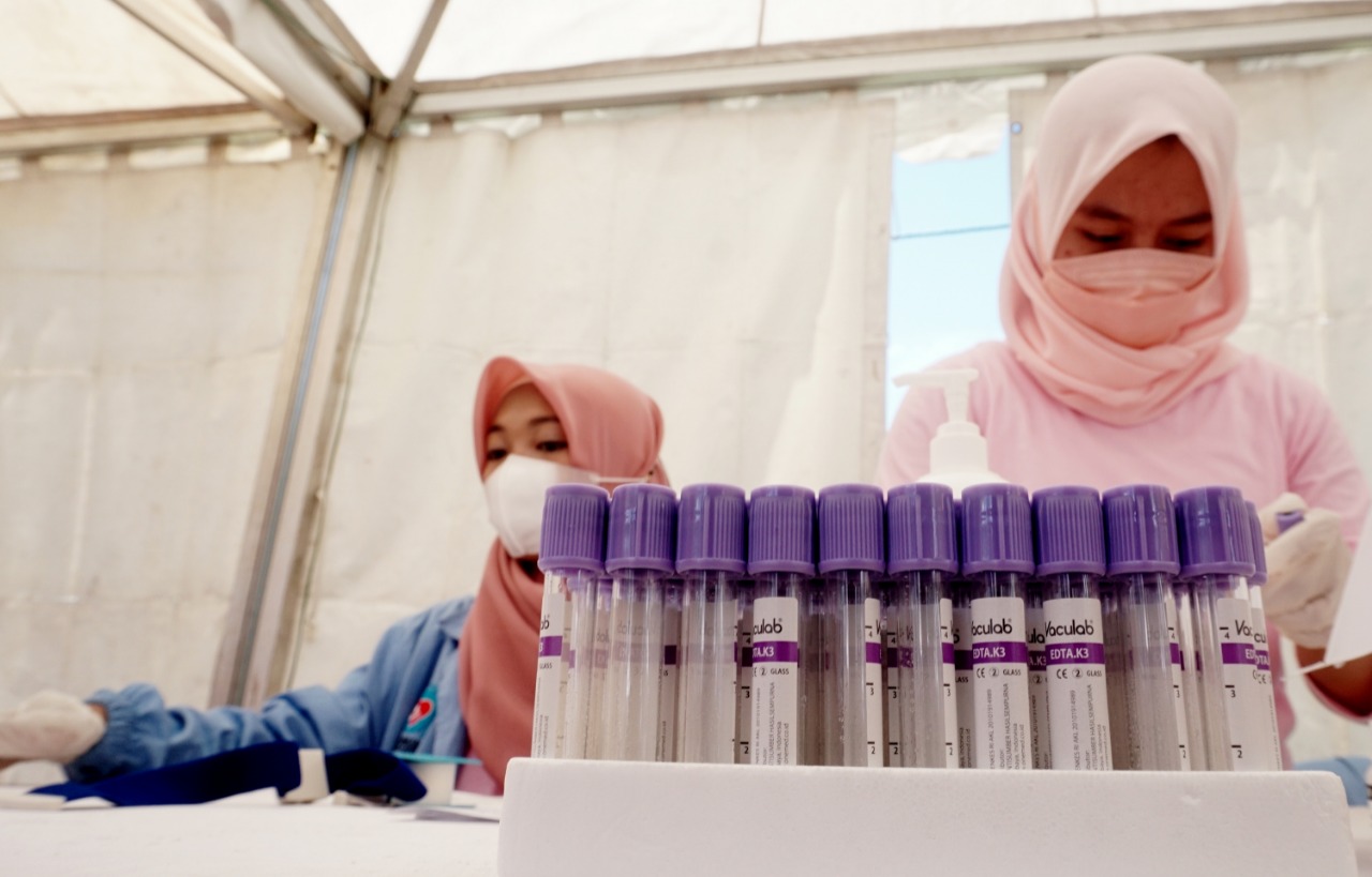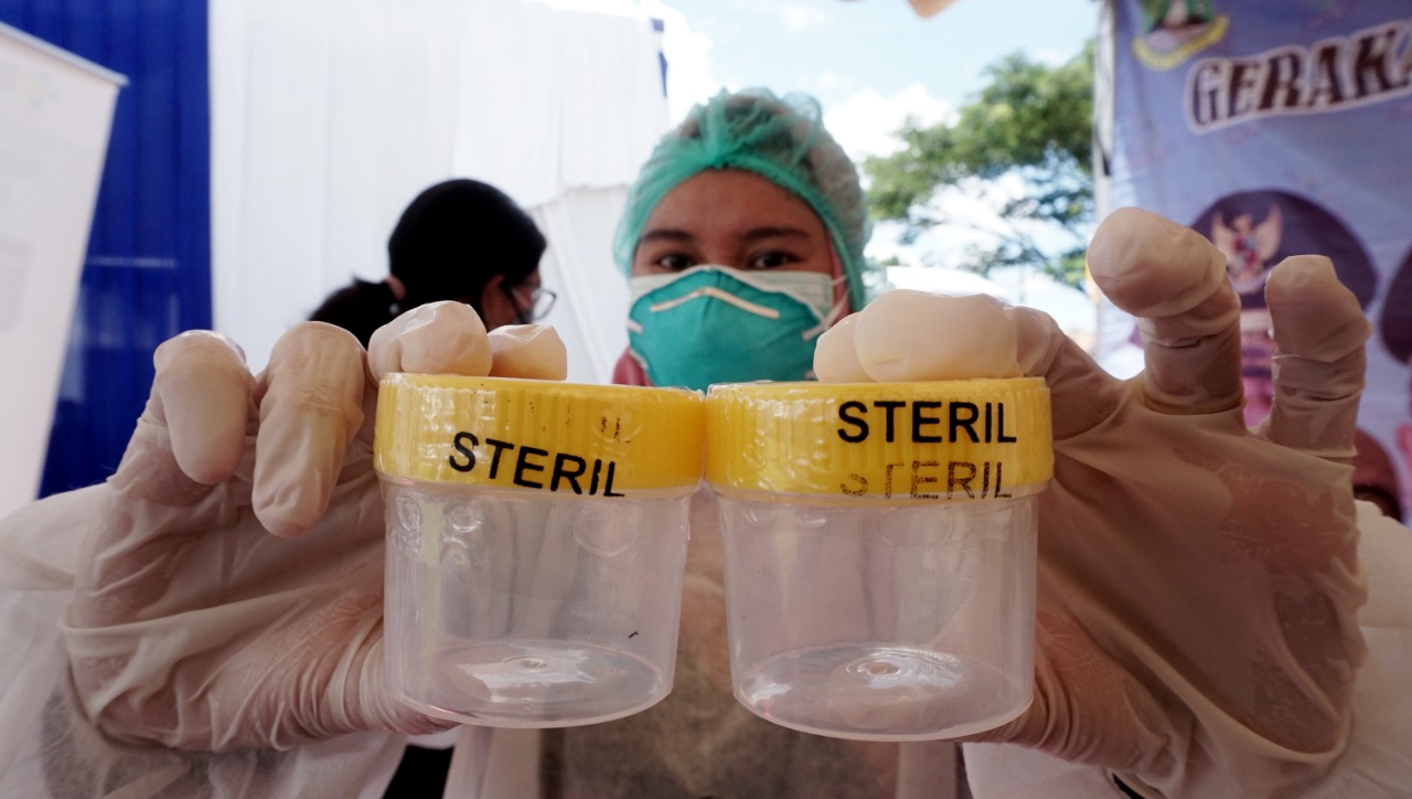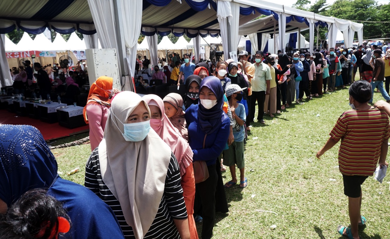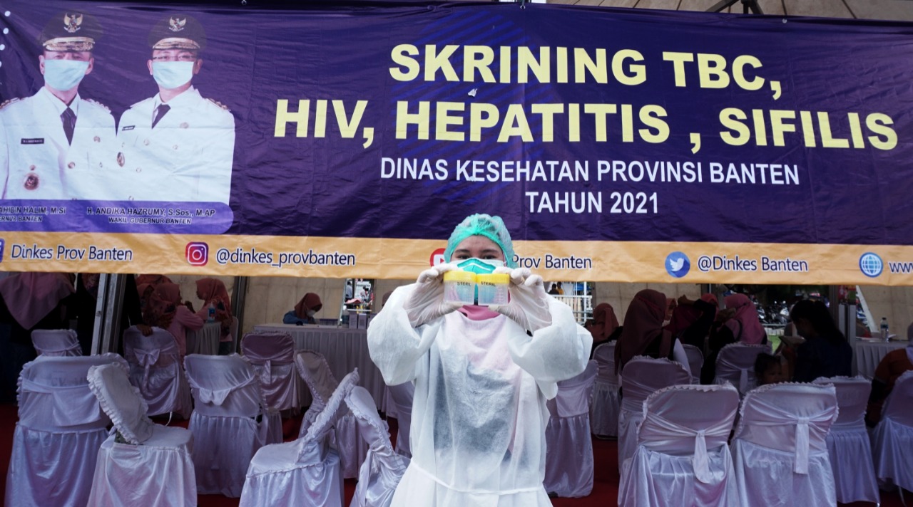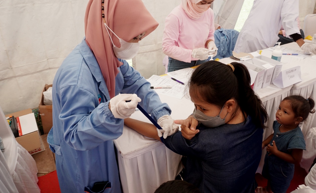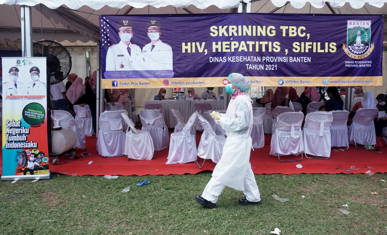 Pemerintah Provinsi Banten menggelar pengobatan geratis dalam memperingati Hari Kesehatan Nasional ke-57 tahun bagi warga Kabupaten Tangerang. Acara yang dilakukan di Lapangan Bola Kecamatan Legok Kabupaten Tangerang ini di padati warga, terlihat antrian panjang warga yang akan mengecek kesehatannya menjadi bukti antusias warga untuk melakukan cek kesehatan, terutama pengecekan kesehatan penyakit menular seperti TBC, HIV dan Sipilis, selain itu juga pemerintah Provinsi mengadakan Vaksin dan Sunat Masal. Kamis (25/11/21). Megatrust/Dennys