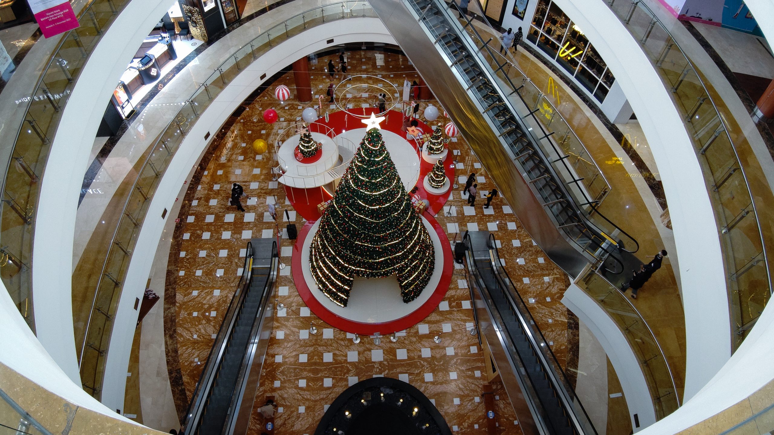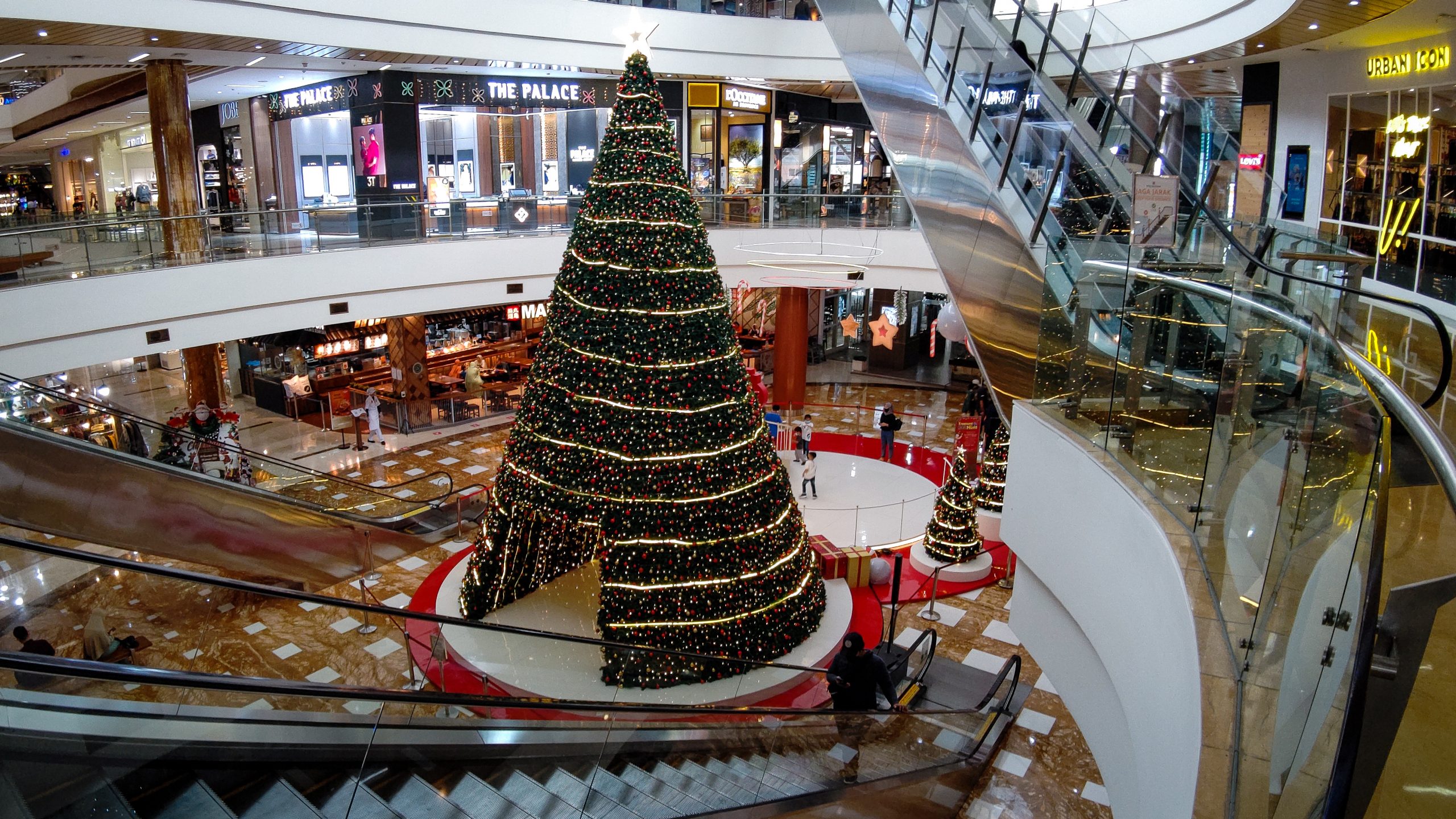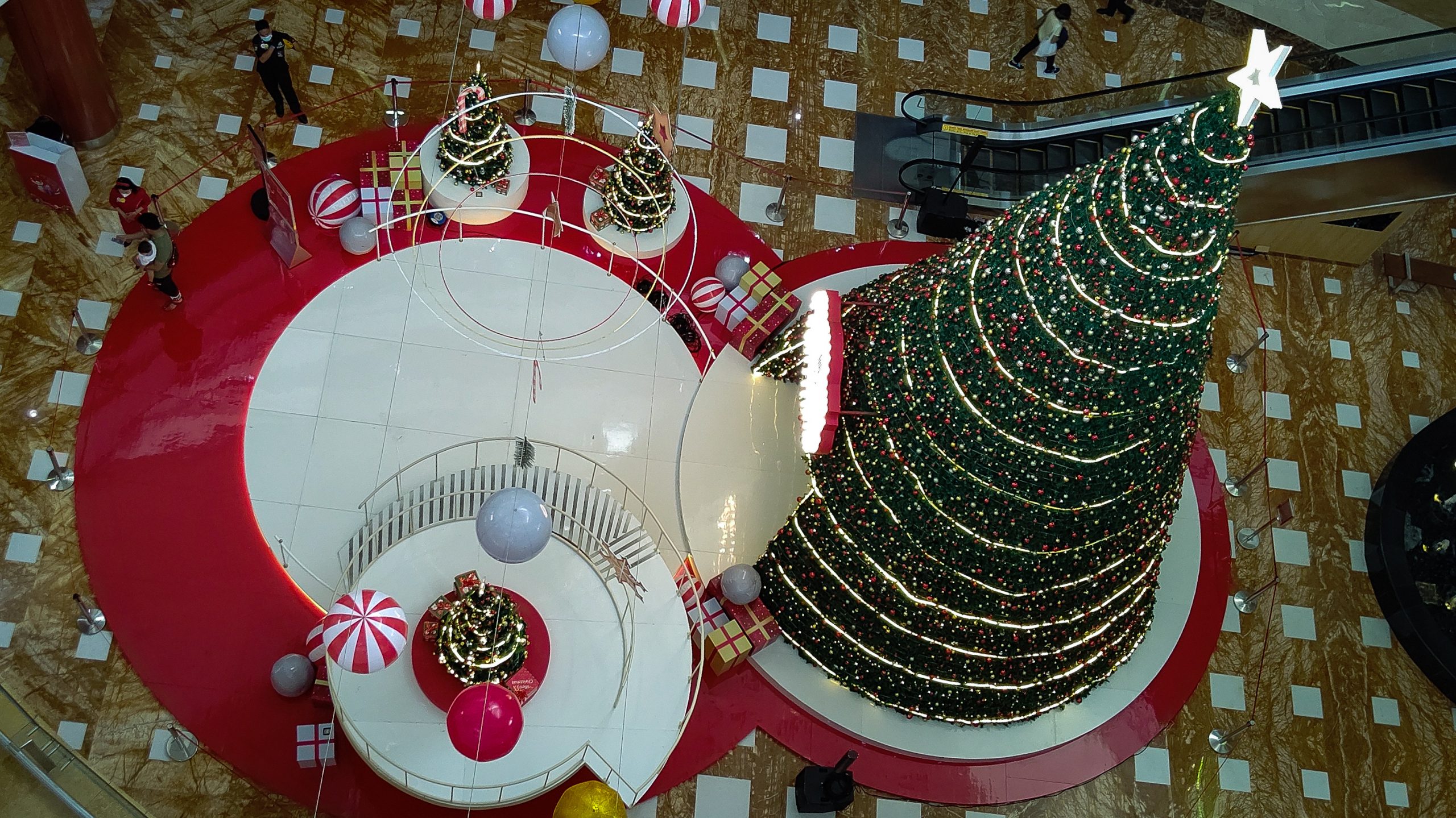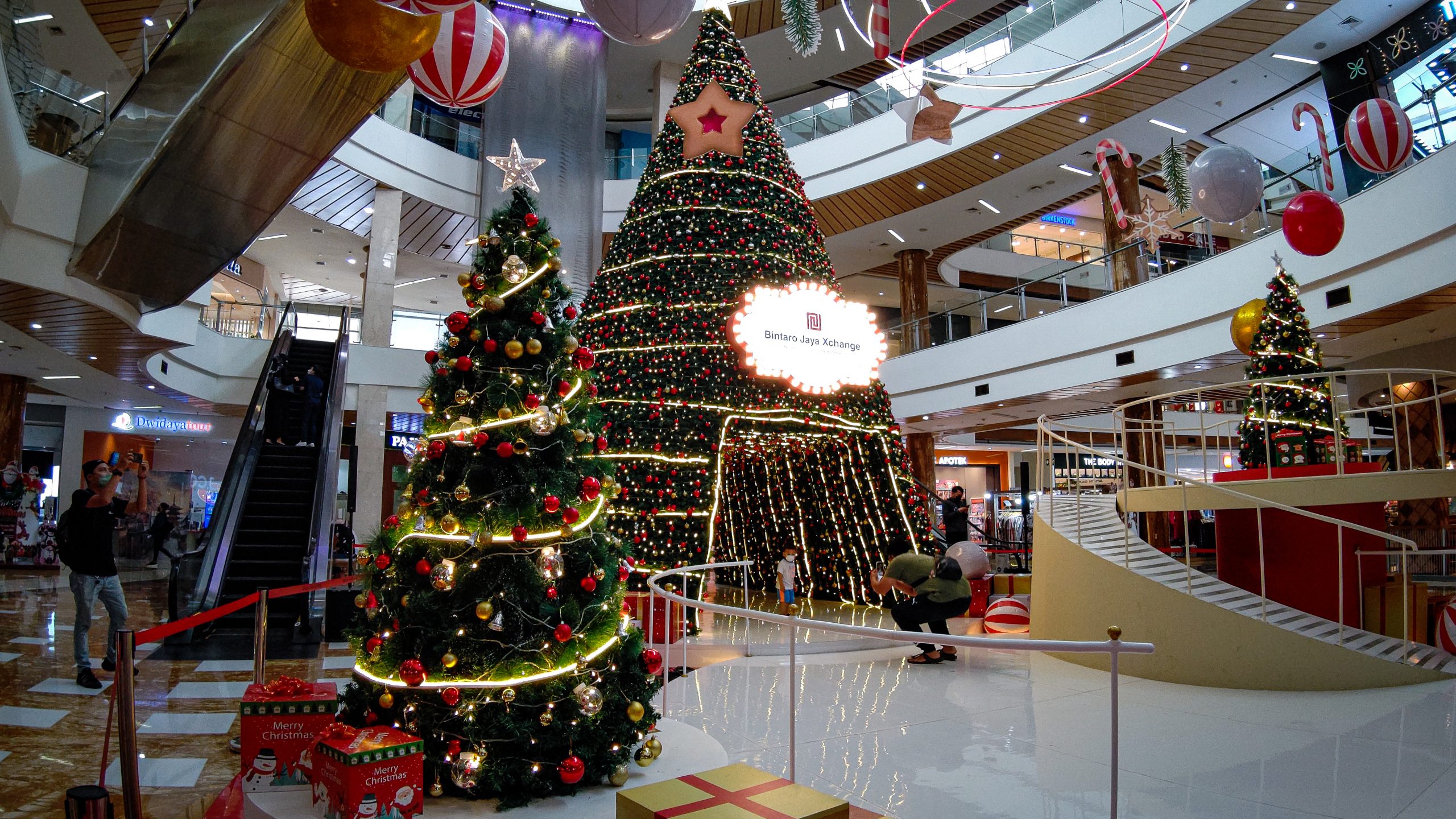 Pohon natal menjulang tinggi di area lobby mall Bintaro Jaya Xchange menarik sejumlah pengunjung untuk berswa foto bareng keluarga, Tangerang Selatan, Kamis (16/12/2021). Pemerintah melalui Instruksi Menteri Dalam Negeri (Inmendagri) Nomor 66 Tahun 2021 menerangkan bahwa akan memperpanjangan jam operasional pusat perbelanjaan dan mall menjadi pukul 09.00 hingga 22.00 WIB serta membatasi jumlah pengunjung tidak melebihi 75 persen dari kapasitas selama periode Natal 2021 dan tahun baru 2022 (Nataru) yang berlaku mulai 24 Desember 2021 hingga 2 Januari 2022. Megatrust/Cecep