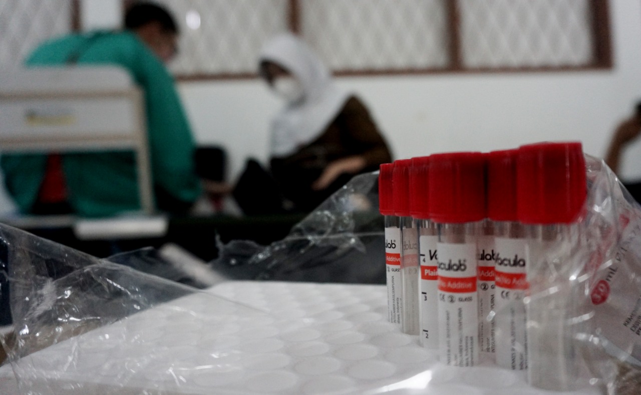 Palang Merah Remaja (PMR) SMA Negeri 2 Kota Tangerang adakan donor darah di Ruang Hijau, acara tersebut menjadi satu rangkaian dalam Doeta Festival bagi sekolahnya, dengan menargetkan sebanyak 60 pendonor pihak panitia acara mengajak selain para siswa mereka juga mengajak para guru untuk ikut berpartisipasi dalam mendonorkan darahnya. Terlihat para siswa dan guru sedang melakukan donor oleh petugas dari Palang Merah Indonesia (PMI) Kota Tangerang. Kamis (18/11/21). Megatrust/Dennys