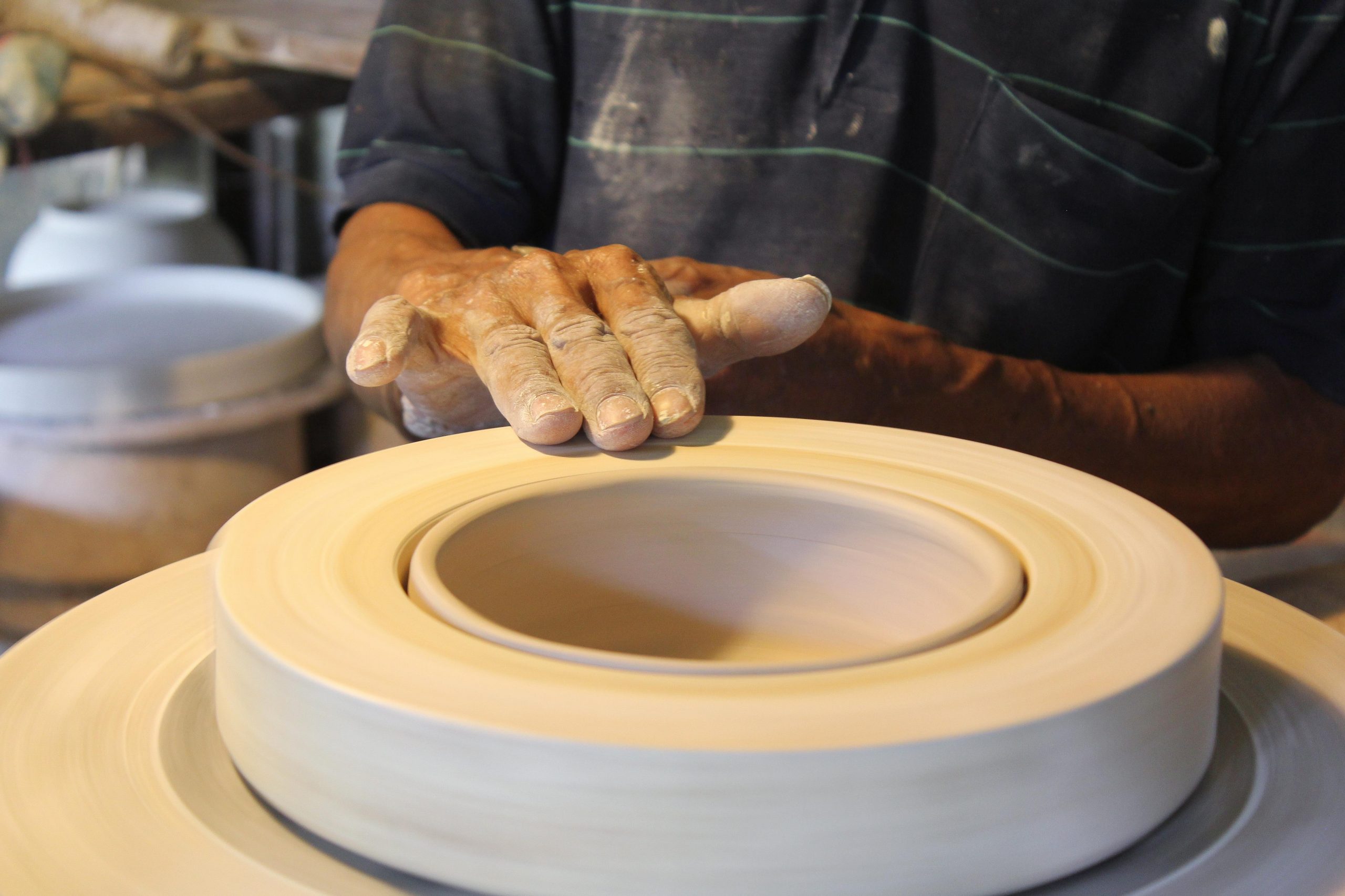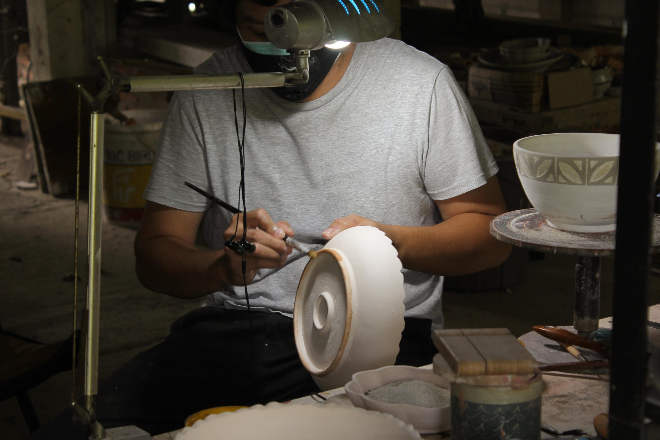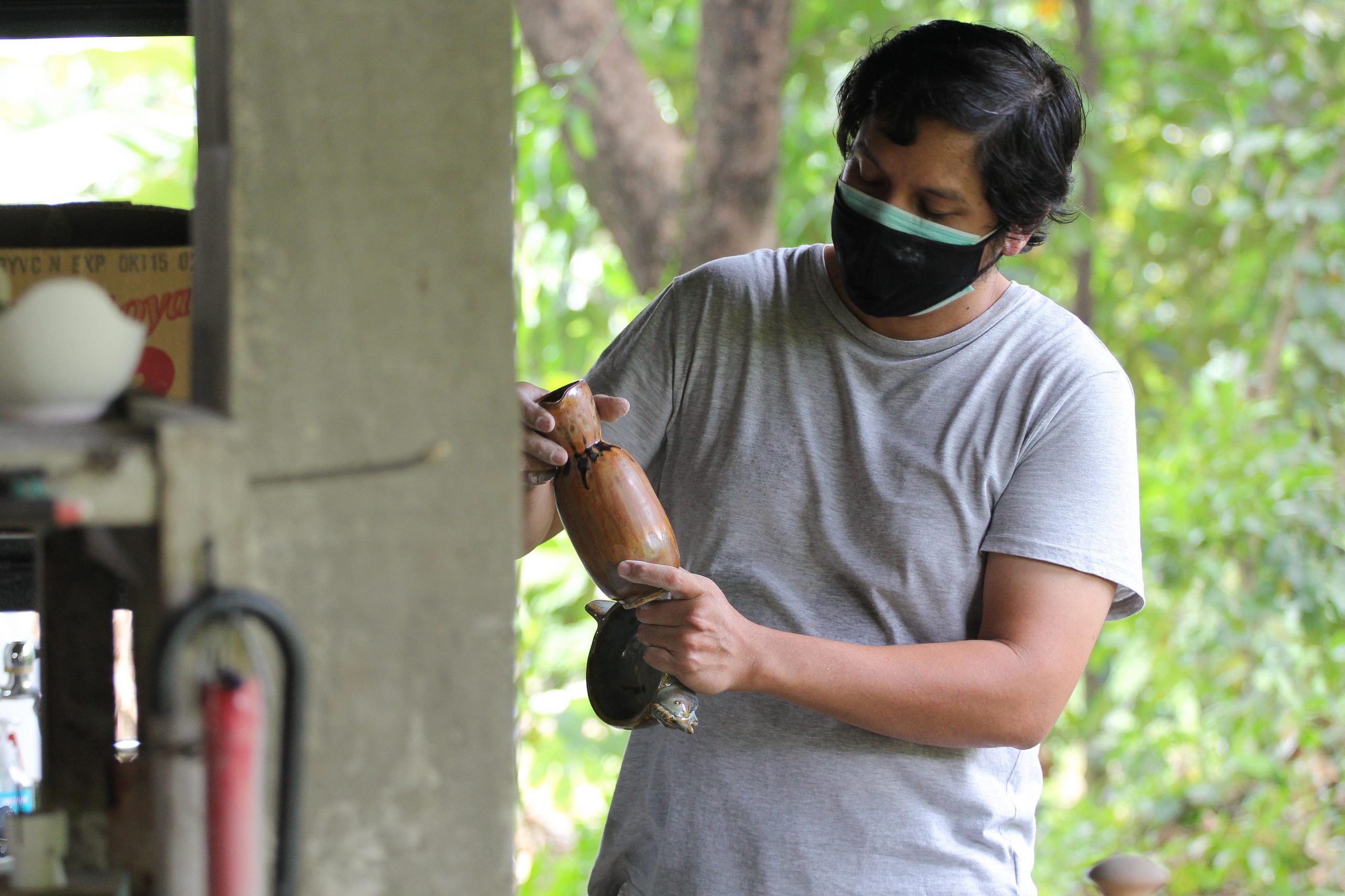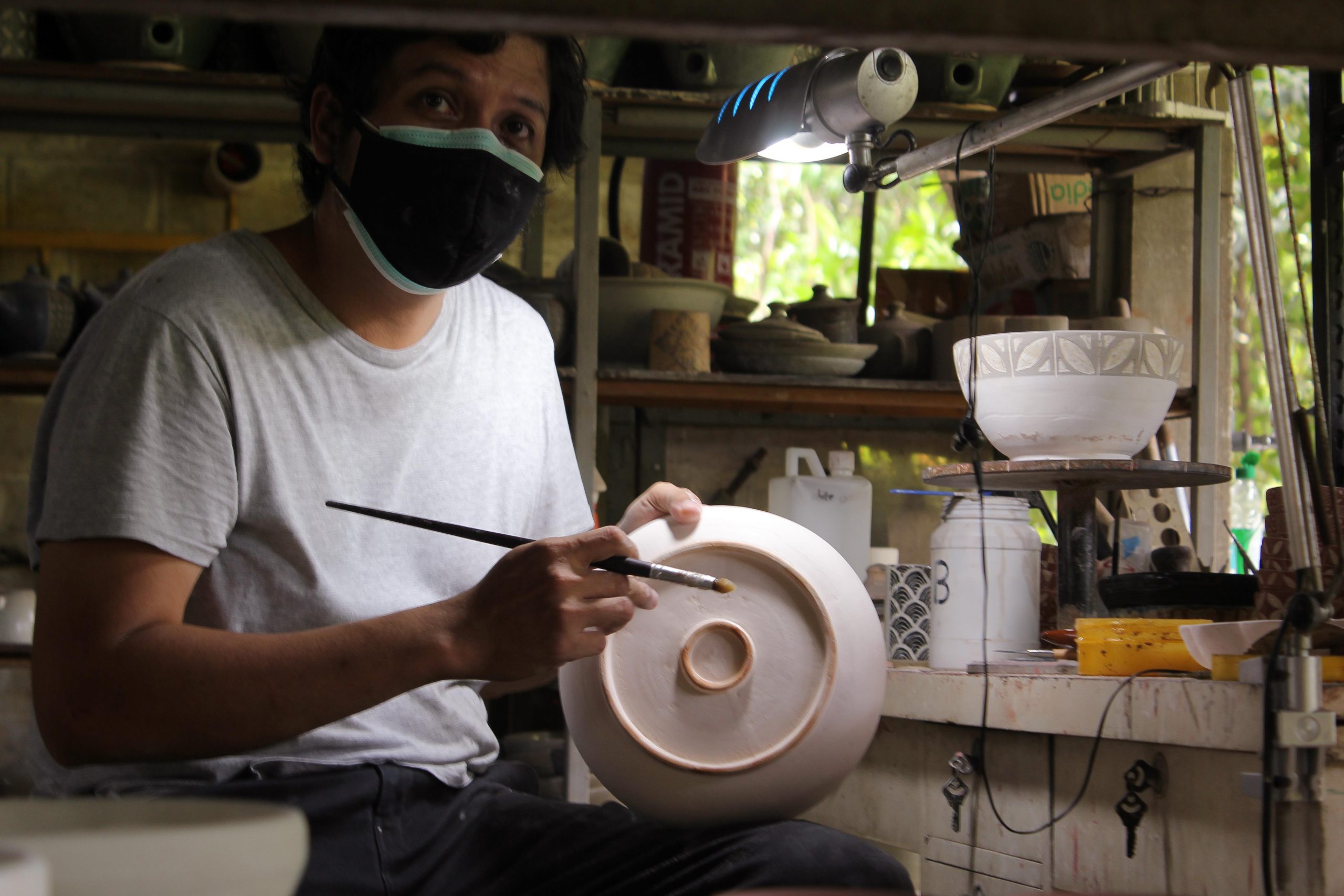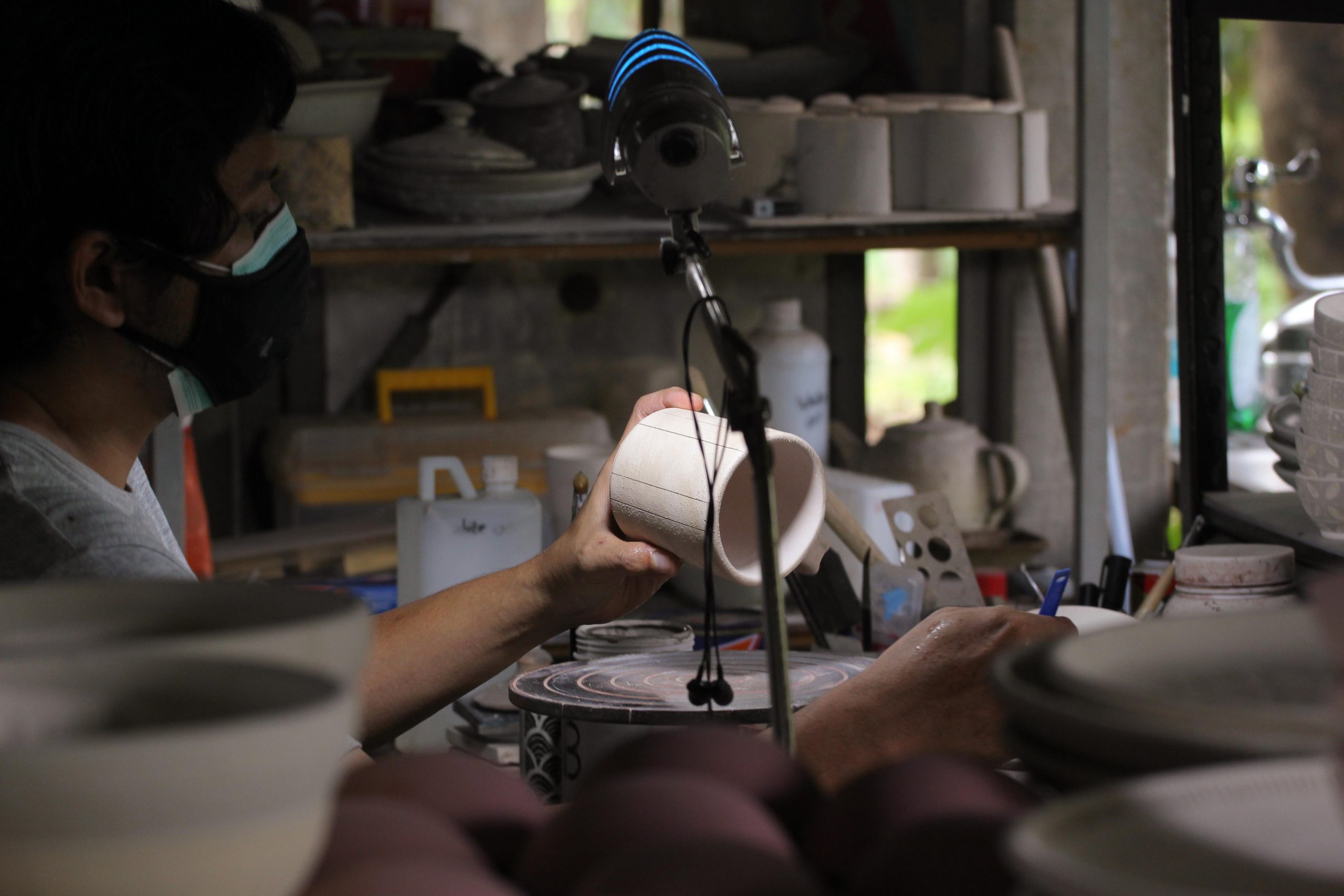 Pengrajin menyelesaikan pembuatan keramik secara manual/handmade di pekunden pottery, Bojongsari, Depok Jawa Barat, Kamis (23/9/21). Produksi rumahan berbahan tanah liat bakaran tinggi tersebut mampu bertahan di masa pandemi Covid-19, setiap bulannya ia memproduksi 300 hingga 400 item keramik yang dijual seharga 50 ribu hingga 3 juta rupiah sesuai pesanan yang datang baik dari hotel maupun restoran. Megatrust/Cecep