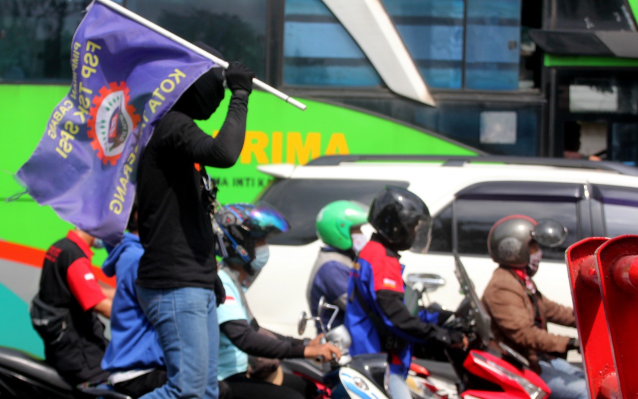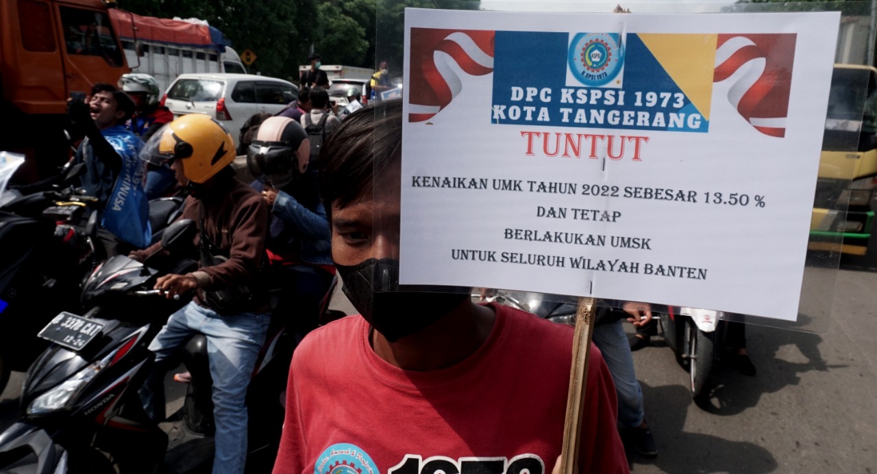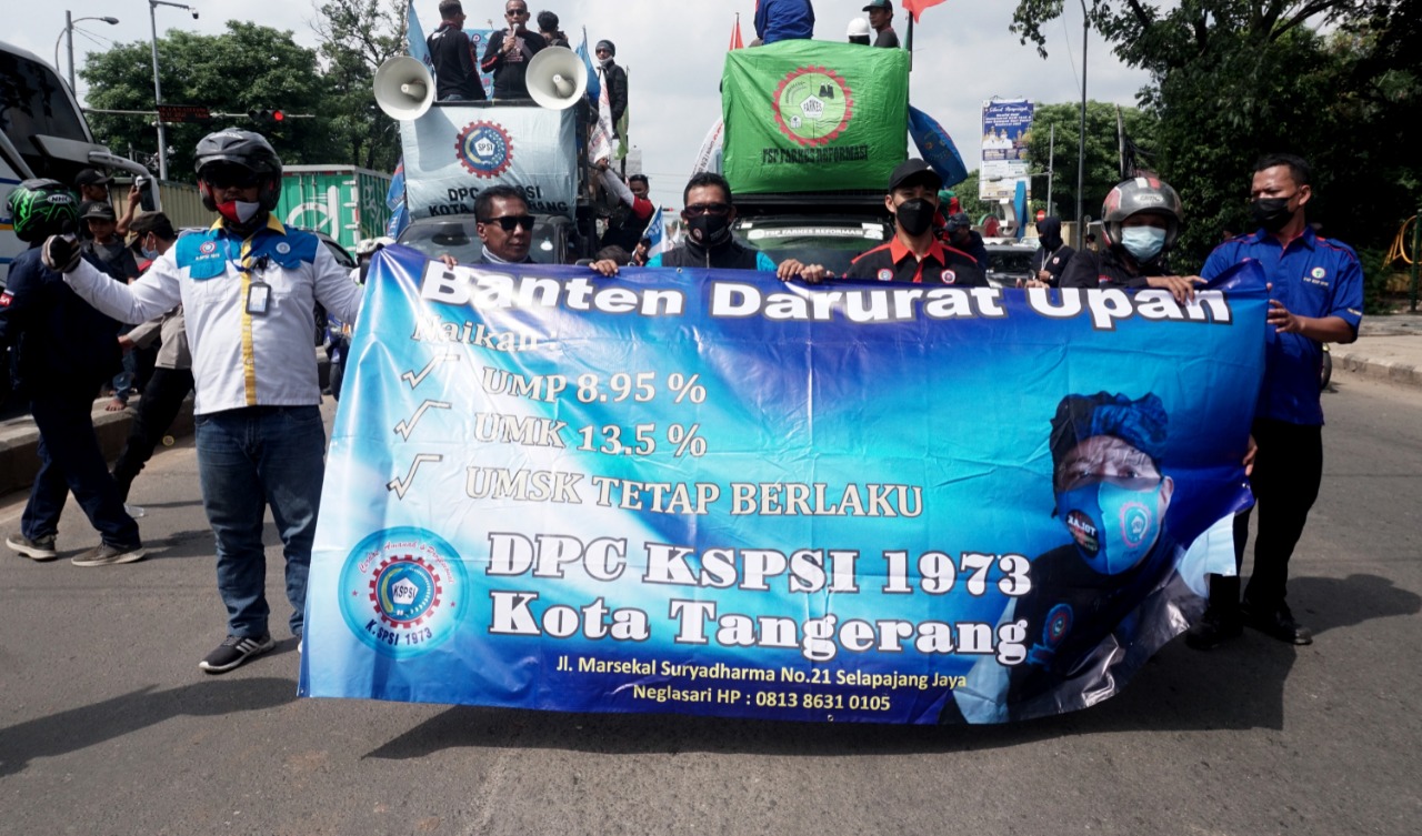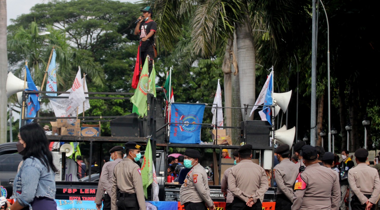 Ratusan Buruh Kota Tangerang kembali turun kejalan untuk menuntut upah layak, dalam aksinya Ratusan buruh melakukan aksi menuntut kenaikan upah di 2022 sebesar 13,5 persen dari upah 2021 di Pusat Pemerintahan Kota Tangerang. Massa yang datang langsung disambut oleh kawalan puluhan personel polisi. Dalam aksinya, mereka melalukan orasi di mobil komando, dan berjalan dengan kondusif. Kamis (18/11/21). Megatrust/Dennys