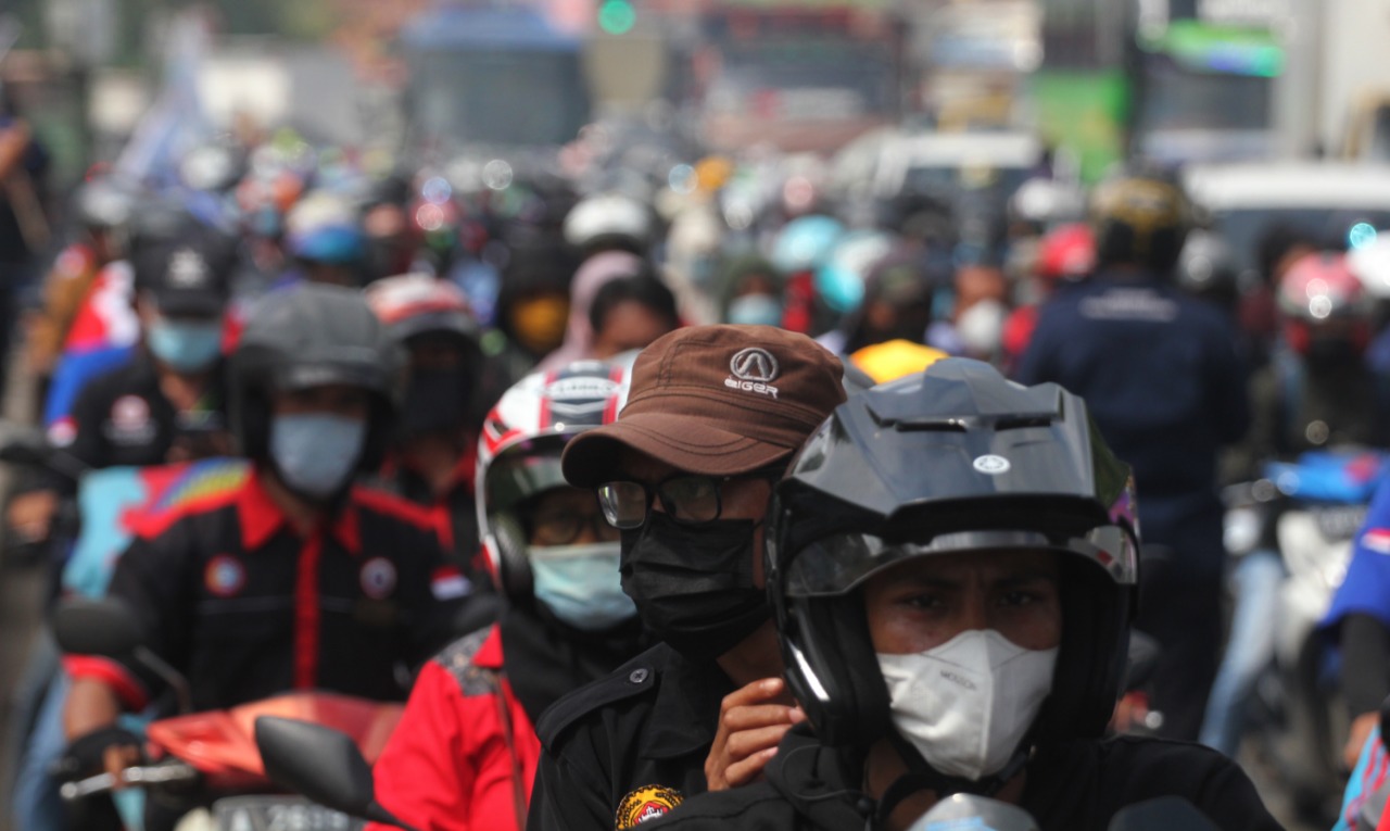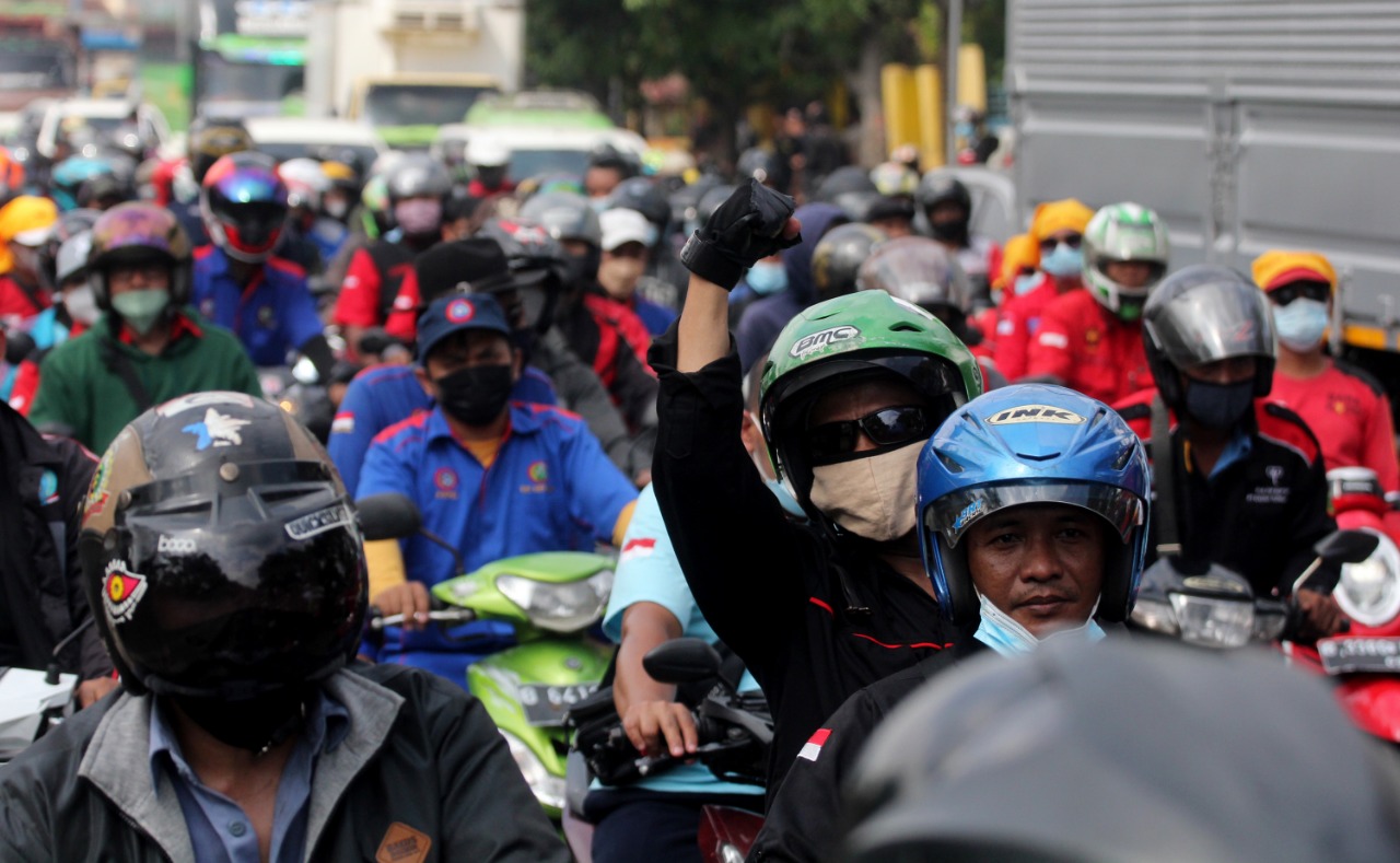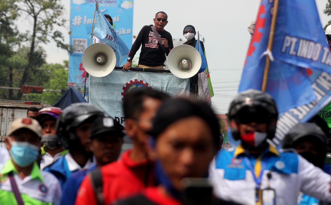 Ratusan Buruh Kota Tangerang kembali turun kejalan untuk menuntut upah layak, dalam aksinya Ratusan buruh melakukan aksi menuntut kenaikan upah di 2022 sebesar 13,5 persen dari upah 2021 di Pusat Pemerintahan Kota Tangerang. Massa yang datang langsung disambut oleh kawalan puluhan personel polisi. Dalam aksinya, mereka melalukan orasi di mobil komando, dan berjalan dengan kondusif. Kamis (18/11/21). Megatrust/Dennys
