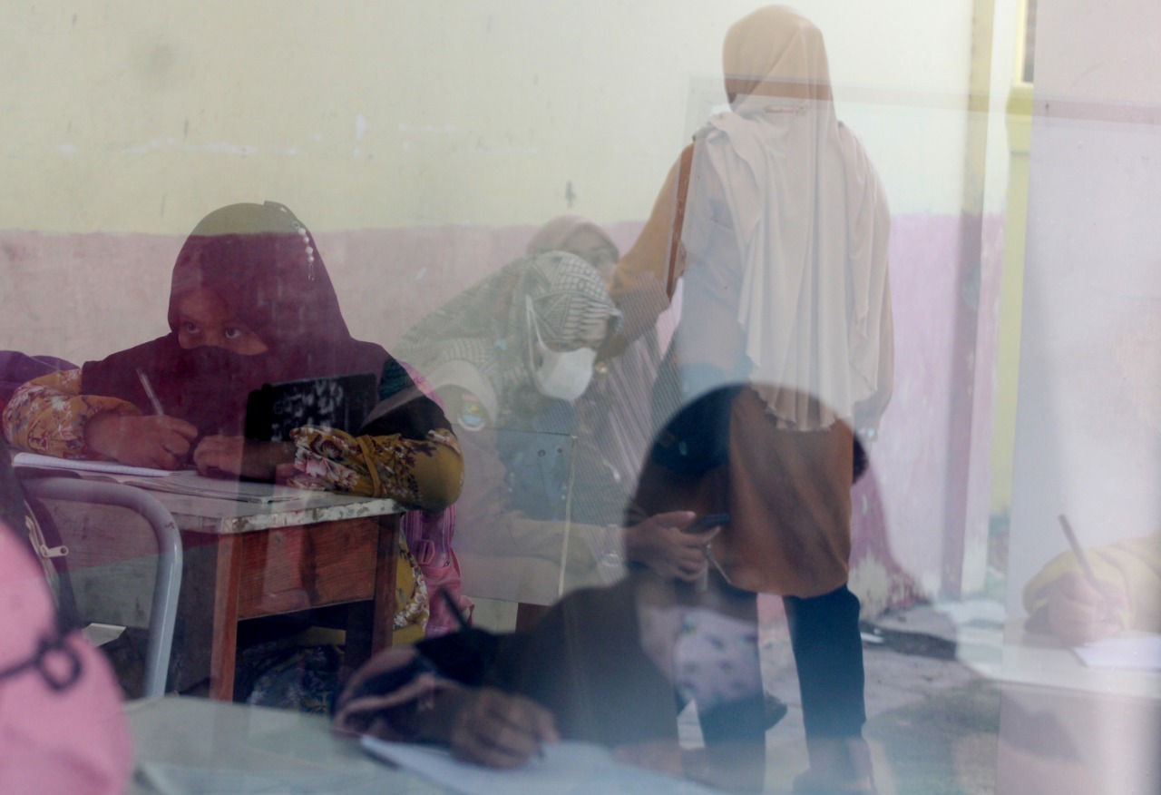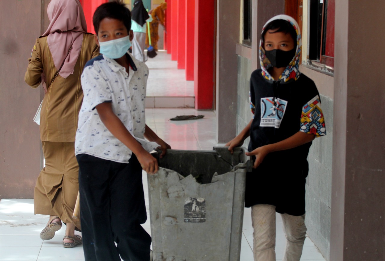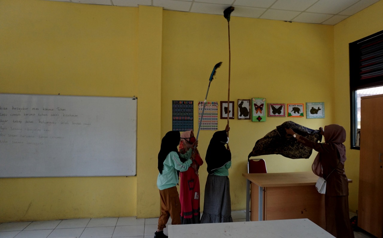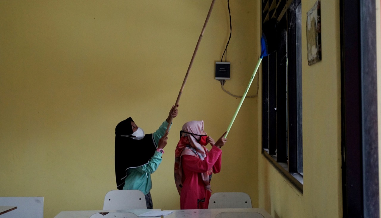Hari pertama Pembelajaran Tatap Muka (PTM) di Sekolah Dasar Negeri (SDN) Kiara Payung Desa Kiara Payung, Kecamatan Pakuhaji Kabupaten Tangerang mulai melakukan aktifitasnya, sekolah dasar yang sempat di tutup oleh Pemilik tanah tersebut selama kurang lebih 2 bulan itu kini kembali di buka setelah pihak pemilik tanah kembali melakukan perundingan kembali dengan pemerintah kabupaten tangerang. Terlihat beberapa murid sedang melakukan kerja bakti dengan membersihkan sarang laba-laba yang sudah mulai menempel didinding kelas. Senin (8/11/21). Megatrust/Dennys