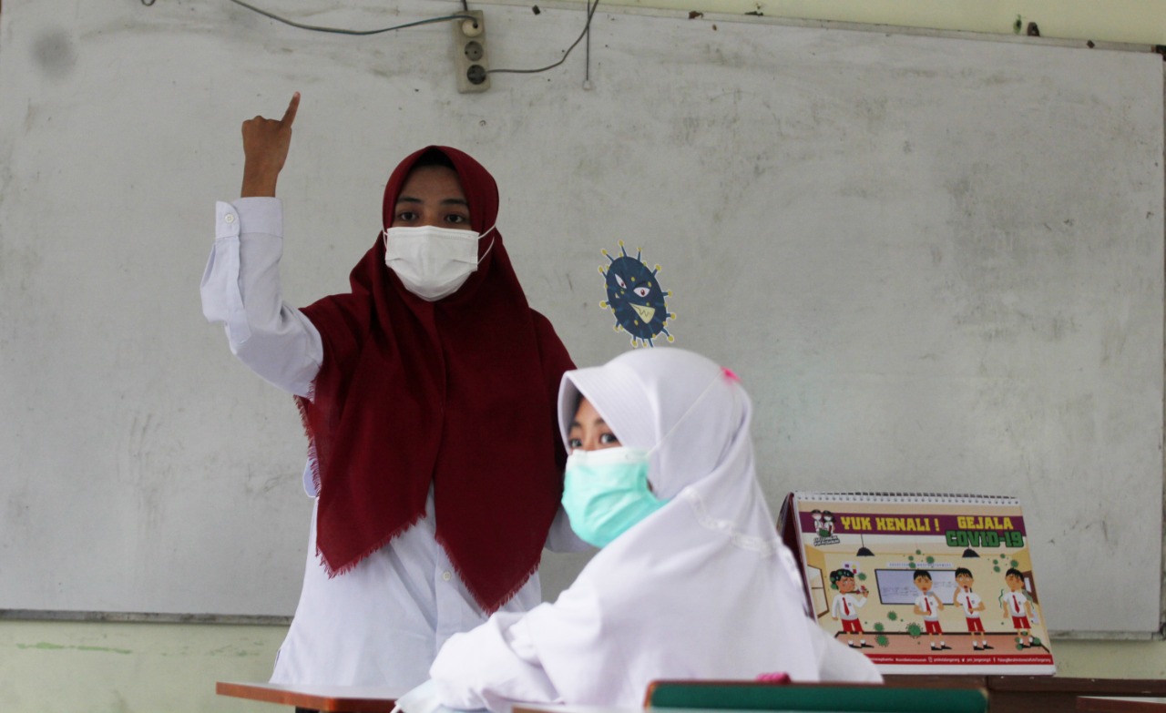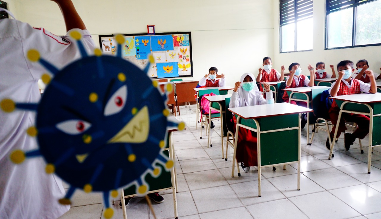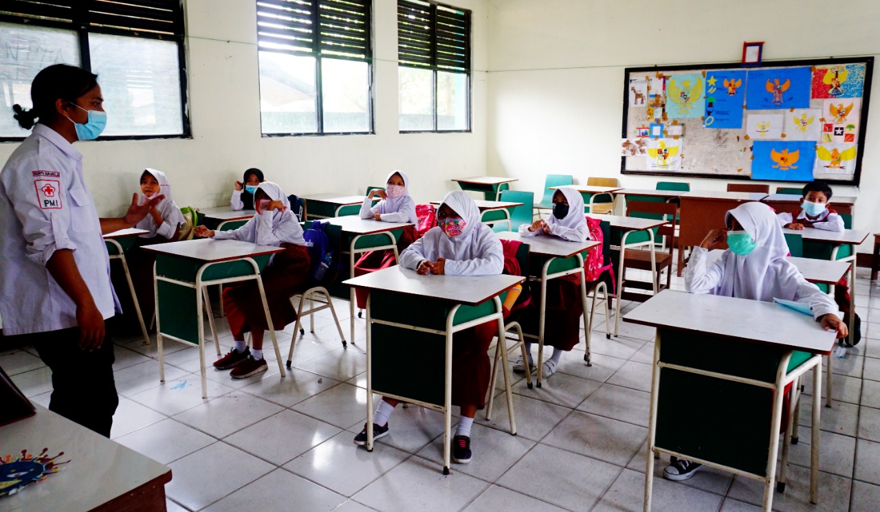 Palang Merah Indonesia (PMI) Kota Tangerang mengajak anak-anak untuk lakukan hidup bersih dimasa pandemi, dalam sosialisasinya di Madrasah Ibtidaiyah (MI) Darul Hikmah Cimone Kecamatan Karawaci, Kota Tangerang, para instruktur selain mengajarkan cara mencuci tangan dengan benar mereka juga memberi pengetahuan tentang bahaya dan ciri orang yang terkena virus Corona-19. Senin (6/9/21). Megatrust/Dennys