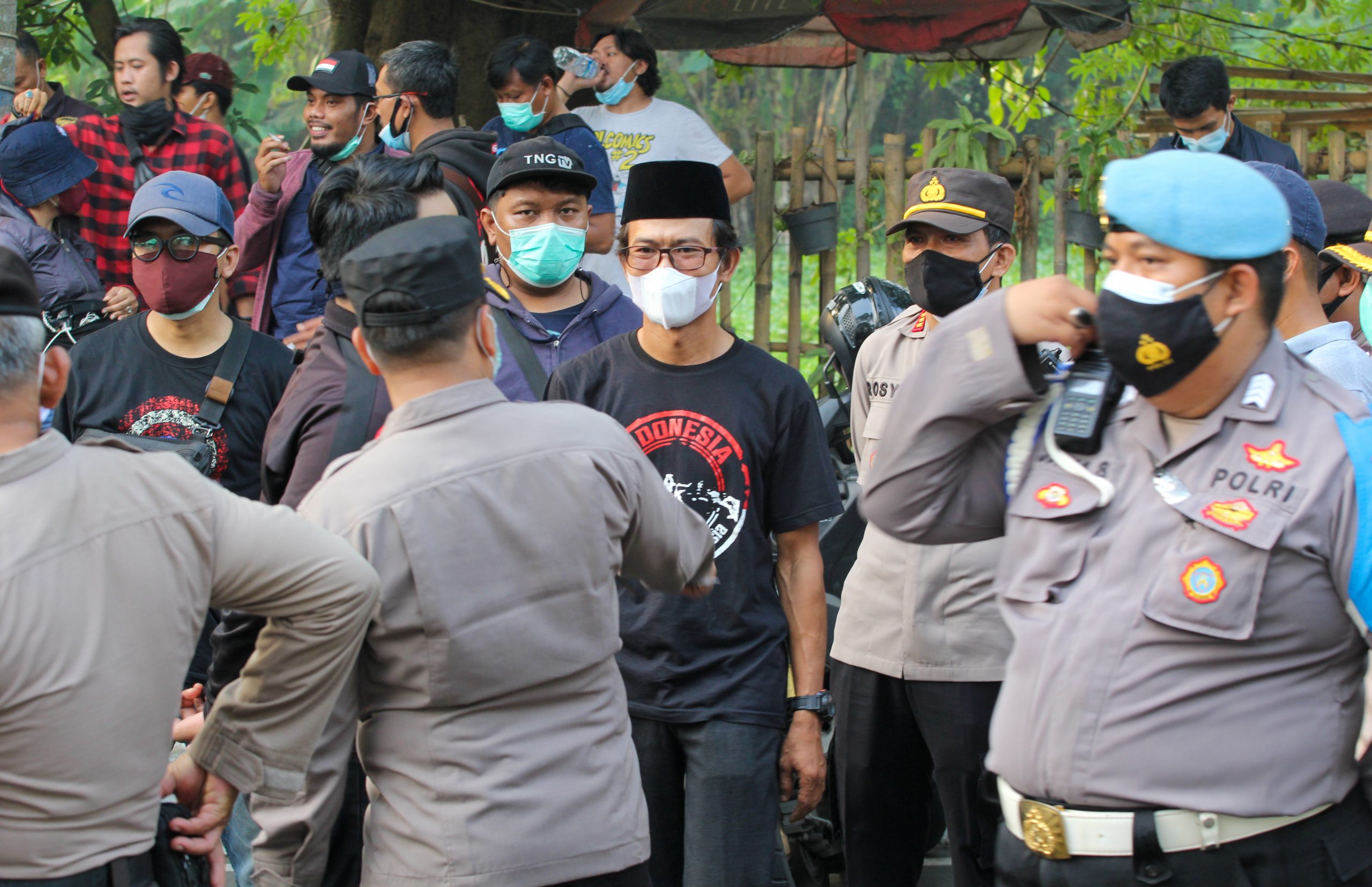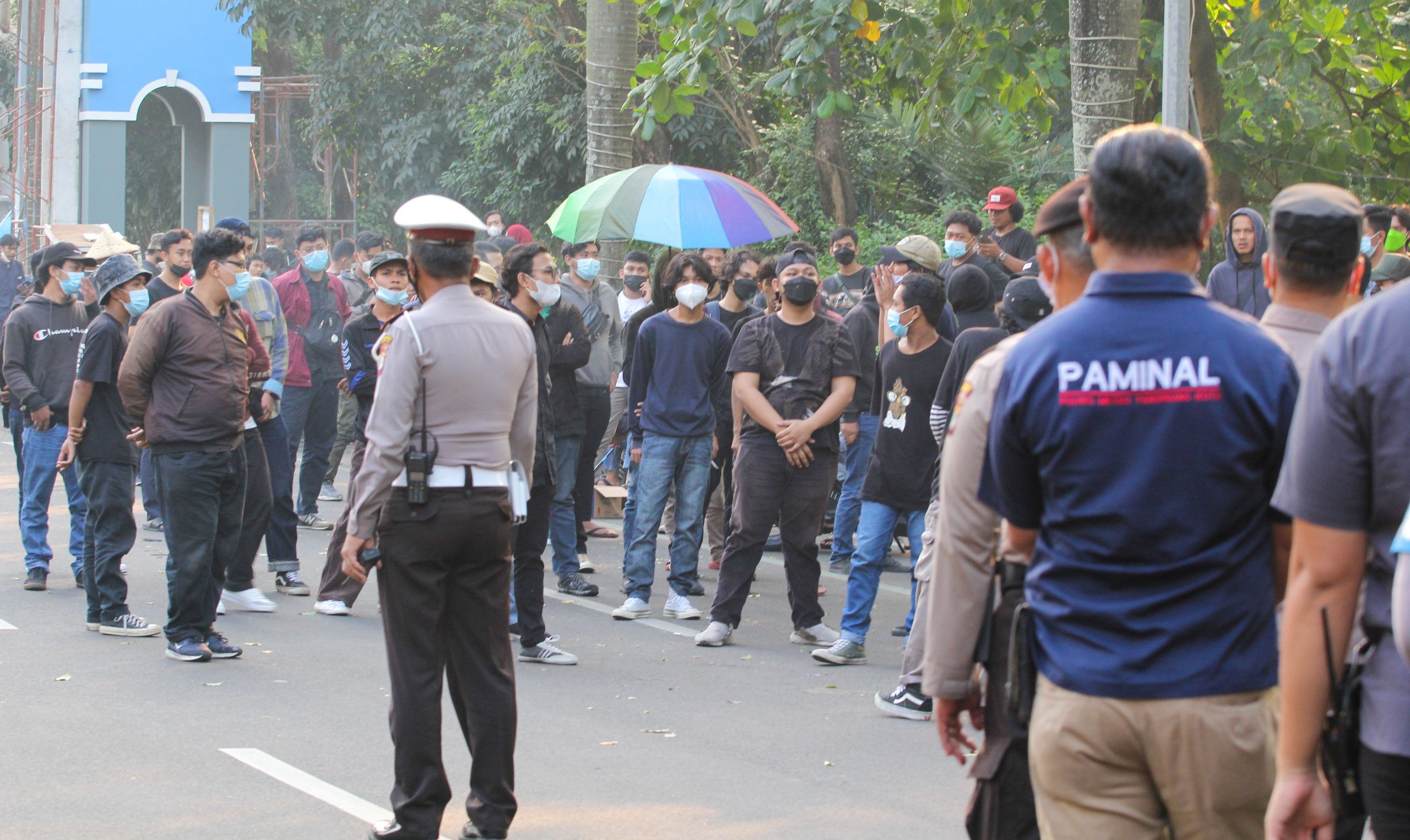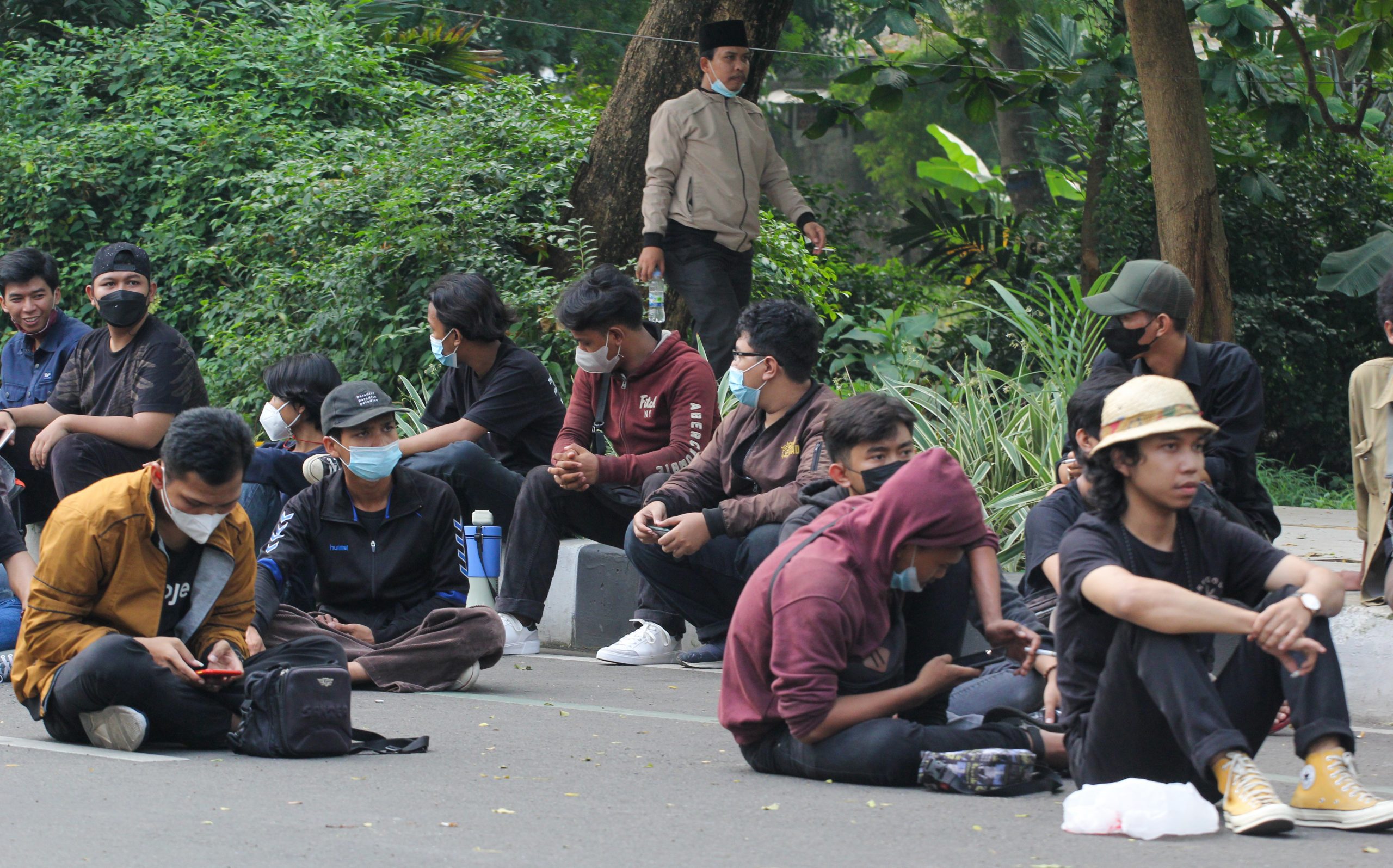 Mahasiswa Tangerang yang tergabung dengan Masyarakat Kota Tangerang menggelar aksinya di pintu masuk Halaman Pusat Pemerintahan Kota Tangerang, dalam tuntutanya aksi gabungan yang mengatas namakan AMPERA (amanat perintah rakyat) ini meminta Tritura (tiga tuntutan rakyat) kepada pemerintah Kota Tangerang untuk menolak perpanjangan PPKM, tindak tegas mafia distribusi dan berisolusi kepada masyarakat untuk tetap bisa berjualan. Dalam aksi tersebut terlihat aparat kepolisian berjaga-jaga di depan pintu masuk kantor walikota. Kamis (22/7/21). Megatrust/Cecep