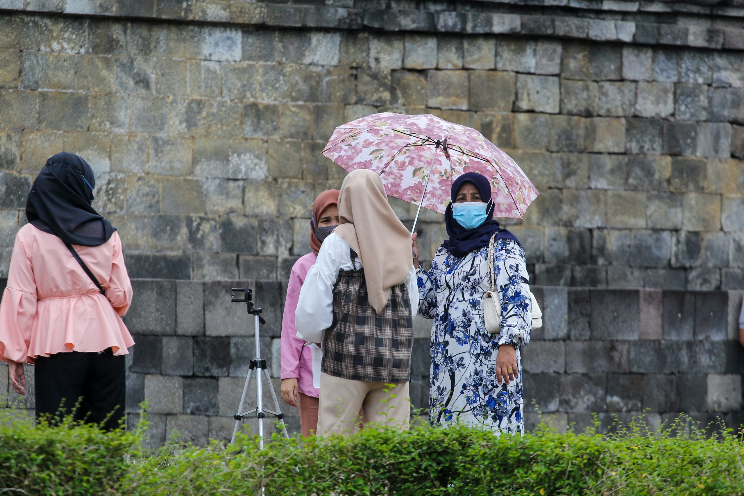 Sejumlah pengunjung berada di Taman Wisata Candi (TWC) Borobudur mengelilingi Candi dan berfoto diarea pembatas, Magelang, Jawa Tengah, Minggu (17/10/2021). Saat ini TWC Borobudur sudah dibuka untuk umum kunjungan wisata dengan menerapkan Protokol Kesehatan (Prokes) dengan syarat sudah divaksin menggunakan Aplikasi Peduli Lindungi namun tidak bisa memasuki area Candi yang dibatasi dengan pembatas untuk berswa foto, sejak awal pandemi TWC Borobudur ditutup sementara untuk pengunjung dan diberlakukan pembatasan kegiatan masyarakat (PPKM) darurat pada (3/7/2021) lalu. Megatrust/Cecep
