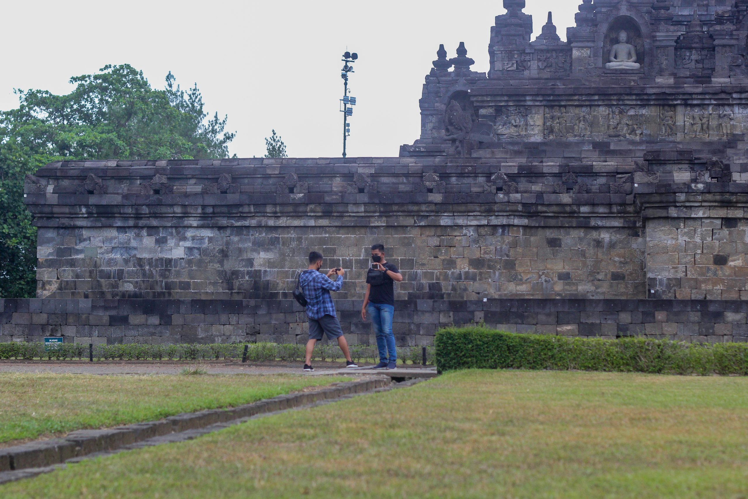 Sejumlah pengunjung berada di Taman Wisata Candi (TWC) Borobudur mengelilingi Candi dan berfoto diarea pembatas, Magelang, Jawa Tengah, Minggu (17/10/2021). Saat ini TWC Borobudur sudah dibuka untuk umum kunjungan wisata dengan menerapkan Protokol Kesehatan (Prokes) dengan syarat sudah divaksin menggunakan Aplikasi Peduli Lindungi namun tidak bisa memasuki area Candi yang dibatasi dengan pembatas untuk berswa foto, sejak awal pandemi TWC Borobudur ditutup sementara untuk pengunjung dan diberlakukan pembatasan kegiatan masyarakat (PPKM) darurat pada (3/7/2021) lalu. Megatrust/Cecep