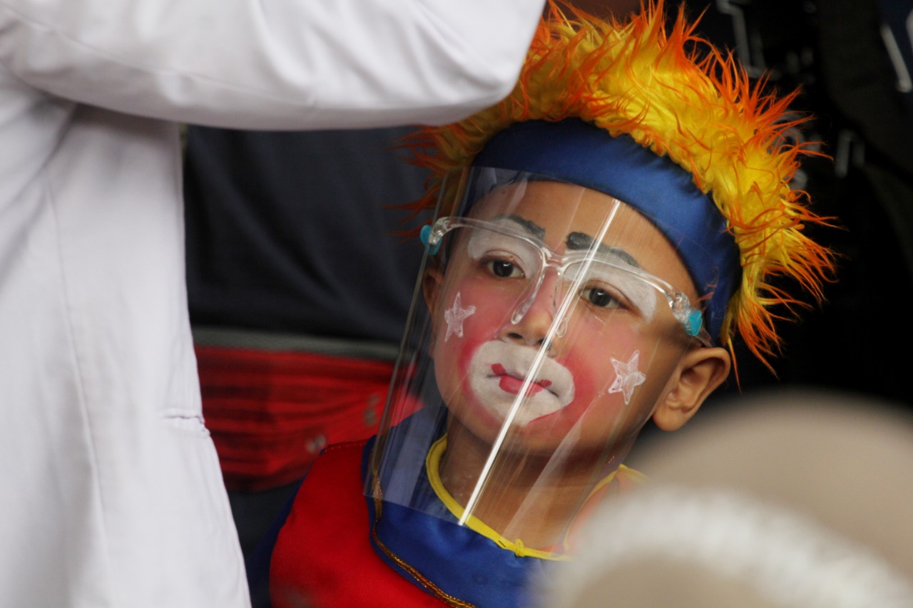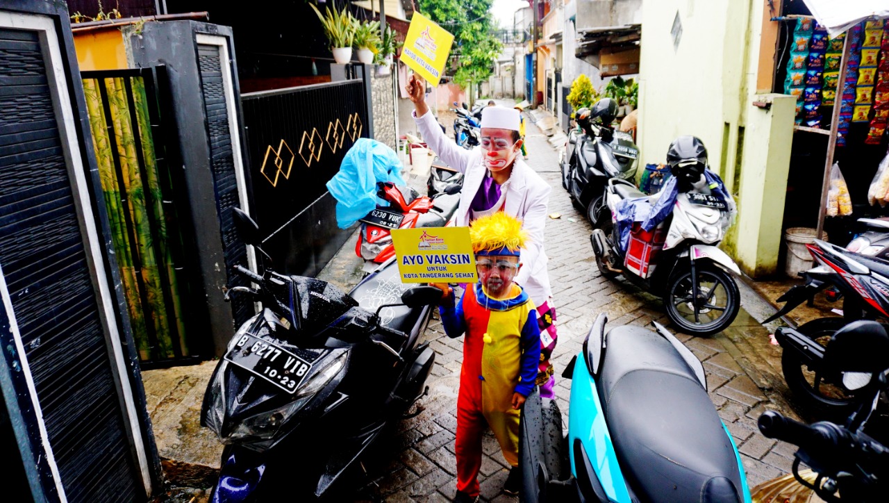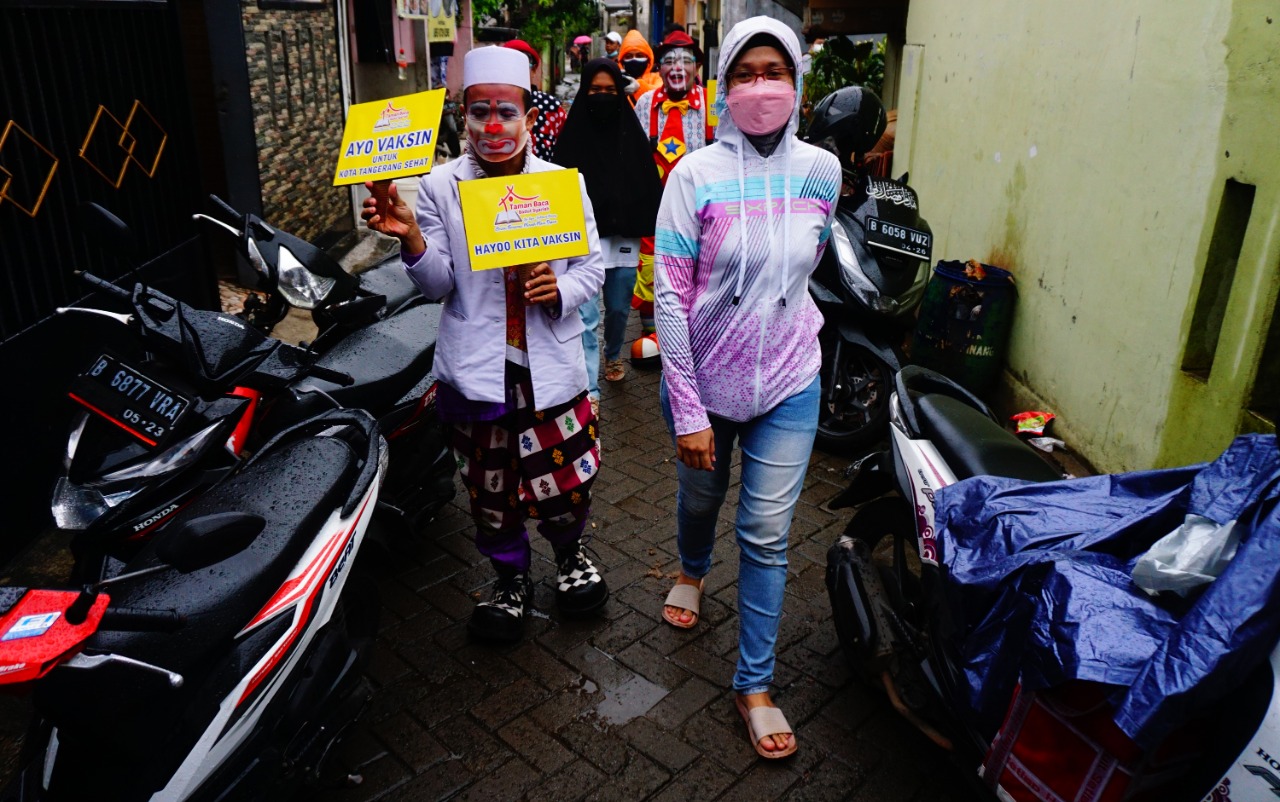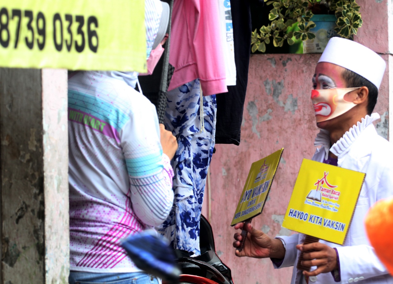 Sebanyak 350 Vaksin di gelar di Rt.08.Rw.04 Kelurahan Sudimara Kecamatan Pinang Kota Tangerang, dalam pelaksanaan vaksinasi kali ini Badut Yahya dan Kawan-kawan ikut serta mengkampanyekan dan ajakan kepada warga untuk melakukan vaksin, para badut tersebut berkeliling dari rumah-kerumah untuk menjemput warga yang akan di vaksin menuju Musholah Al-azhar yang menjadi lokasi Vaksin tersebut. Selasa (14/9/21). Megatrust/Dennys