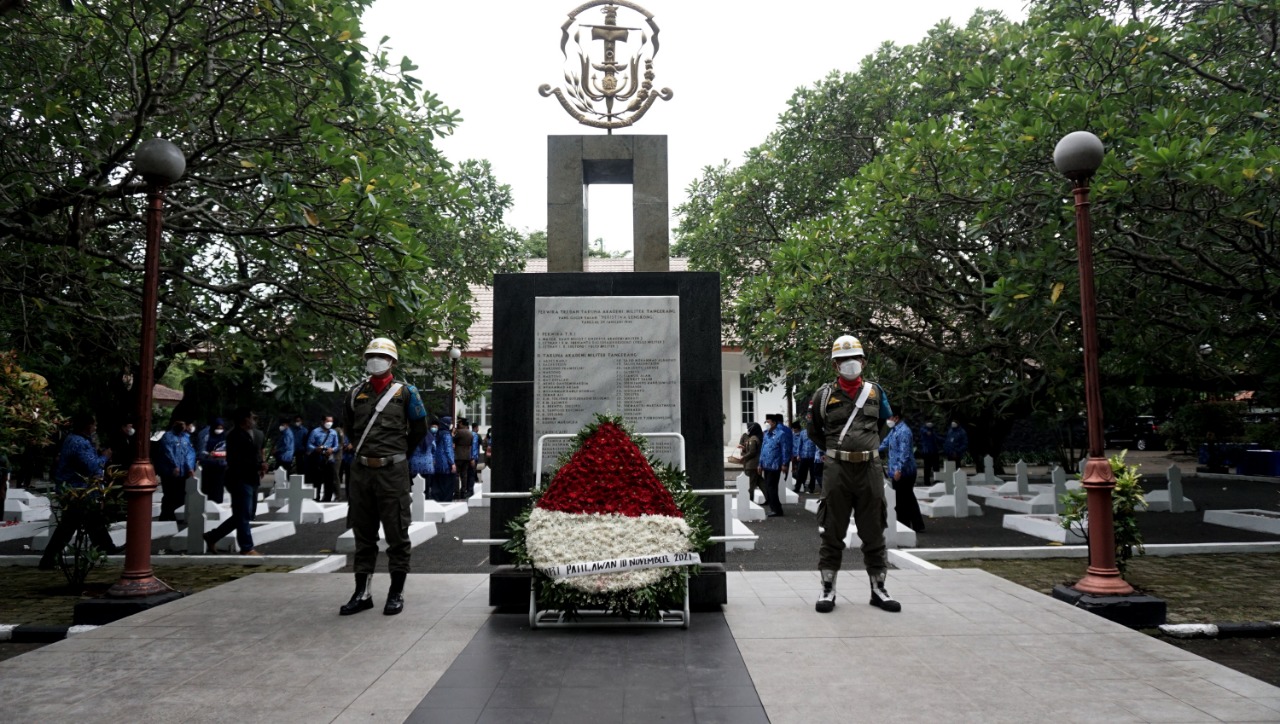 Pemerintah Kota Tangerang beserta jajarannya lakukan upacara di Taman Makam Pahlawan Taruna Kota Tangerang, upacara tersebut guna memperingati hari pahlawan yang jatuh pada 10 November 2021 ini, dalam upacara tersebut di hadiri oleh Dandim 0506, Kapolres Metro Tangerang Kota, Kejari, Ketua DPRD Kota, Ketua MUI Kota Tangerang dan Wakil Walikota Tangerang, serta seluruh jajaran forkopinda Kota Tangerang, usai melakukan upacara para undangan dan seluruh peserta melakukan tabur bunga di seluruh makam. Rabu (10/11/21). Megatrust/Dennys