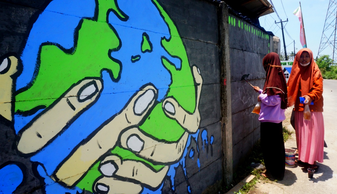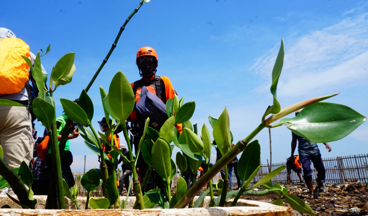 Relawan Dompet Duafa lakukan penanaman mangrove di Pulau Sampah Tanjung Burung, Kecamatan Teluk Naga Kabupaten Tangerang. Dalam pelaksanaannya kali ini para relawan juga melakukan mural di tembok Banksampah dengan mengangkat tema World Cleanup Day 2021, acara yang berlangsung di pulau sampah kali ini para relawan mengumpulkan sampah dari lokasi yang akan di tanami mangrove, terlihat pemerhati lingkungan (Dik Doang) turut serta dalam penanaman di lokasi tersebut. Jumat (24/9/21). Megatrust/Dennys
