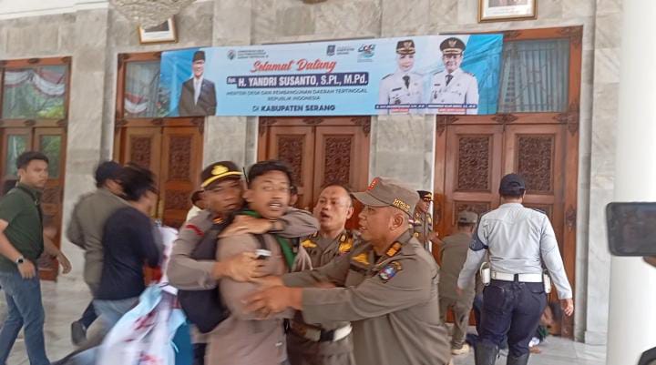 Salah seorang peserta aksi memaksa masuk ke dalam pendopo Bupati Serang yang membuatnya dikejar aparat pengamanan.