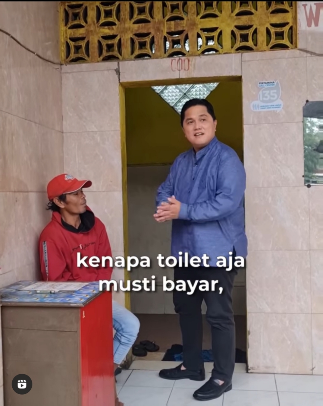 Erick Thohir saat hendak masuk ke toilet di SPBU menegur penjaga toilet. Teguran Erick Thohir kepada penjaga toilet terjadi di SPBU Kecamatan Malasan, Probolinggo, itu diunggah di akun media sosial miliknya @erickthohir