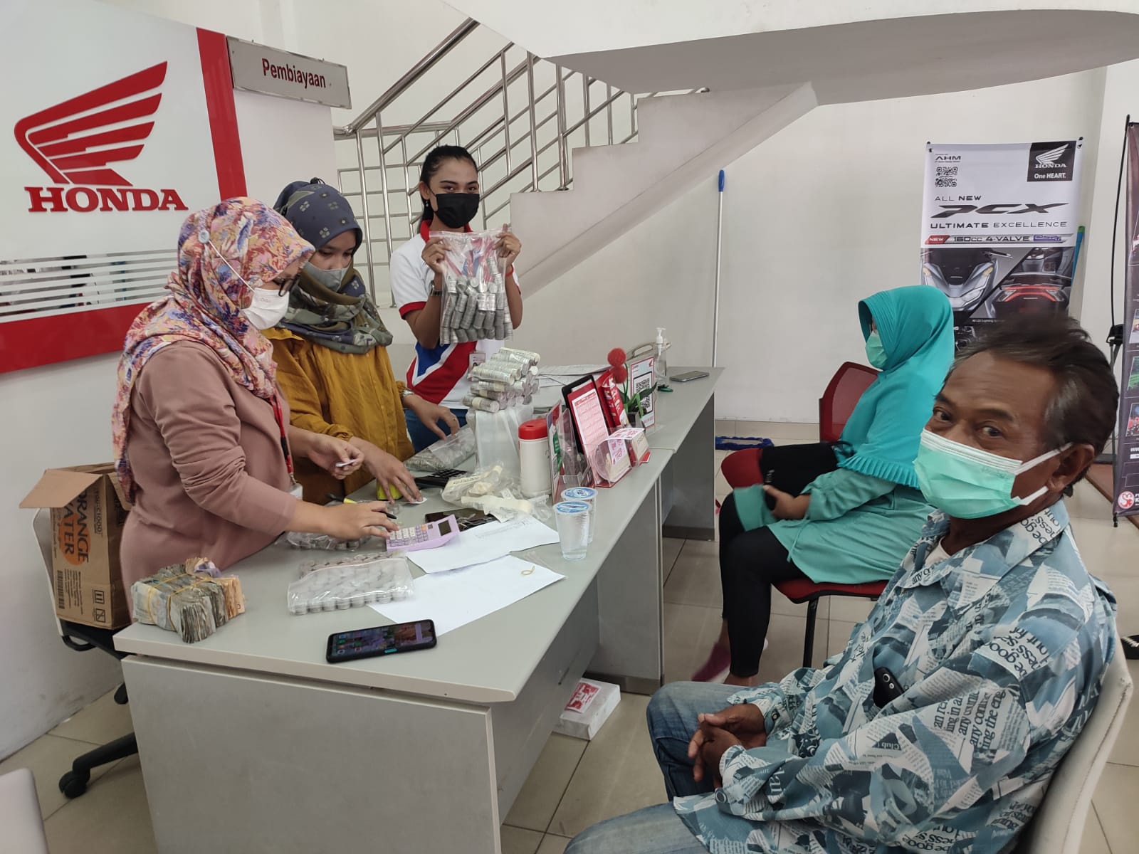 Kedatangan Sunarto yang membawa uang koin bersama istrinya hasil dari menabung selama 5 tahun, disambut hangat oleh para pegawai dealer Honda.