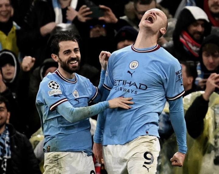 Potret pemain Manchester City, Bernardo Silva (kiri) dan Erling Haaland (kanan) saat merayakan gol ke gawang Bayern Munich. Tangkapan layar instagram @goalcomindonesia