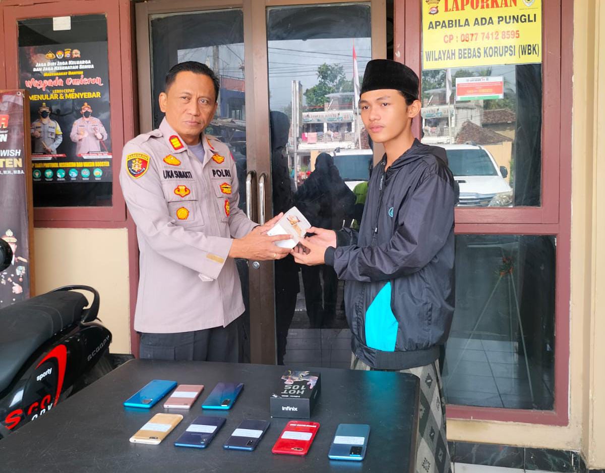 Kapolsek Petir AKP Uka Subakti menjelaskan, pengungkapan 6 unit HP berbagai merk dari hasil penggeledahan dirumah keluarga tersangka ZM.